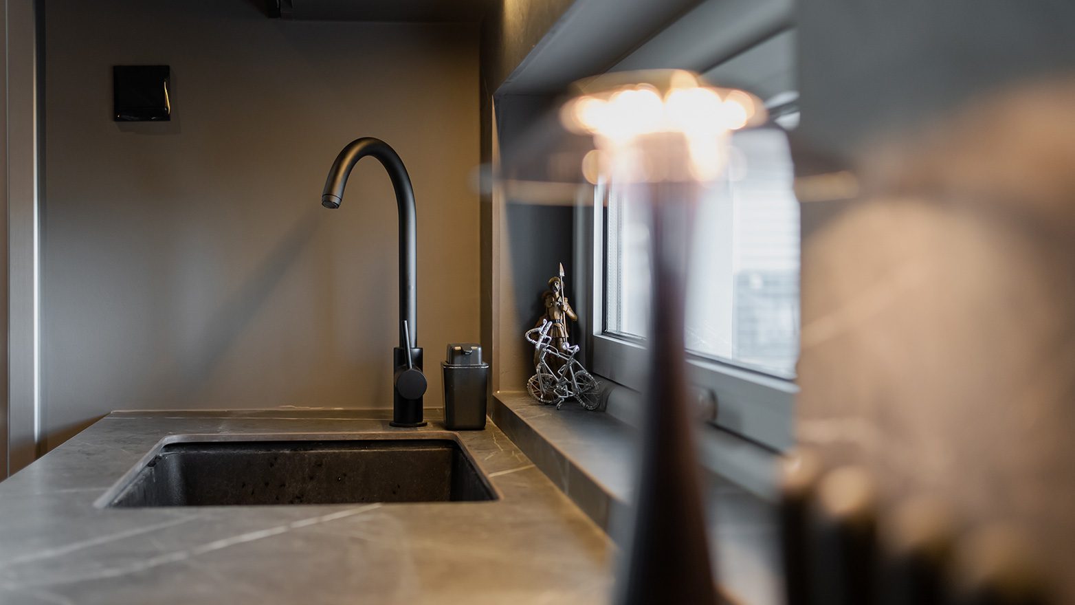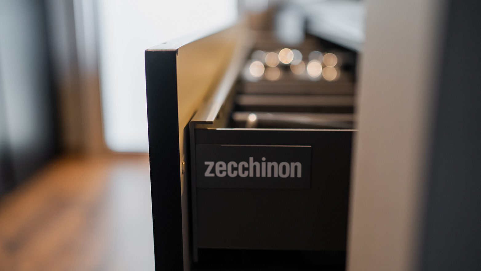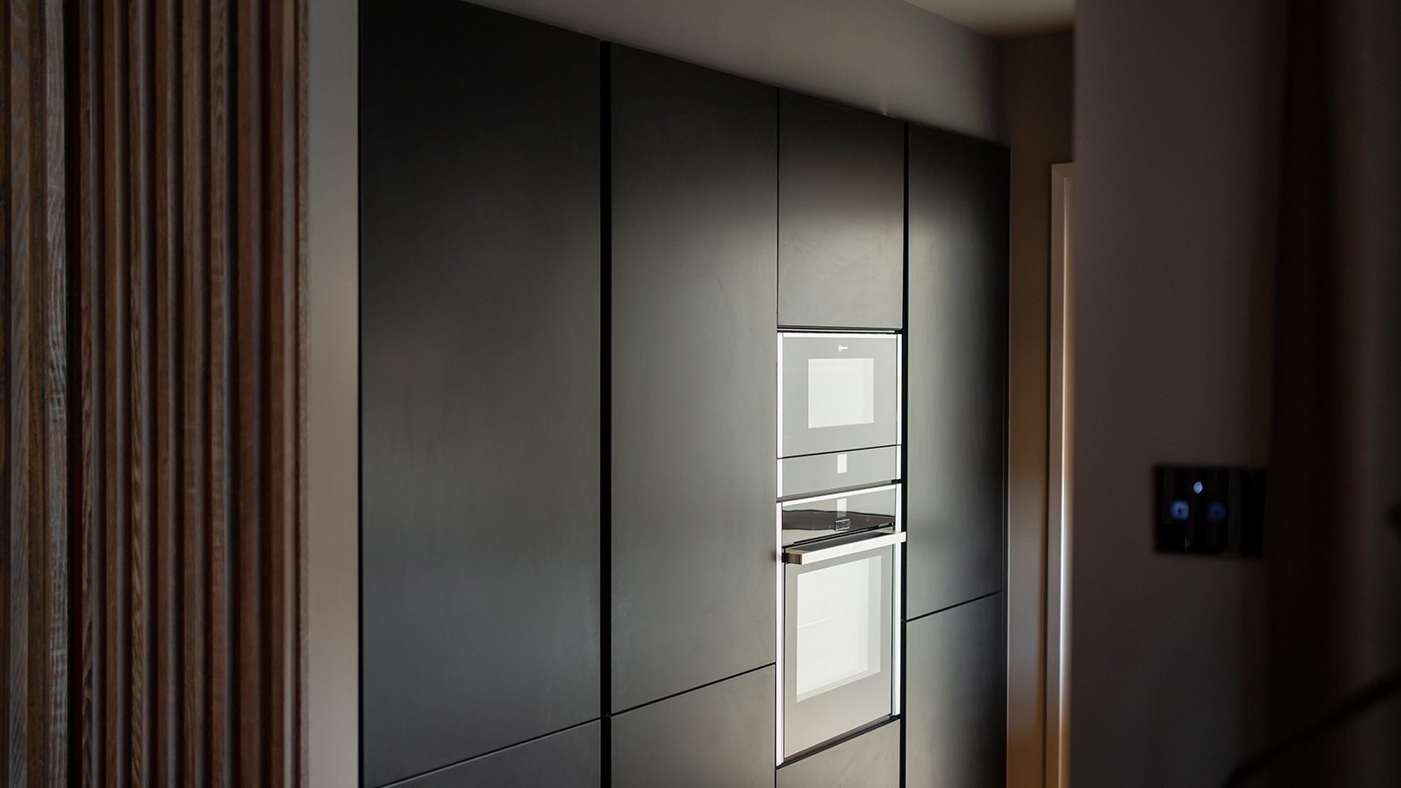 Modules in the kitchen counter and peripherally are developed with Zecchinon Cucine Kalea model in smooth black matt finish, paying extensive attention in practicality and functionality.