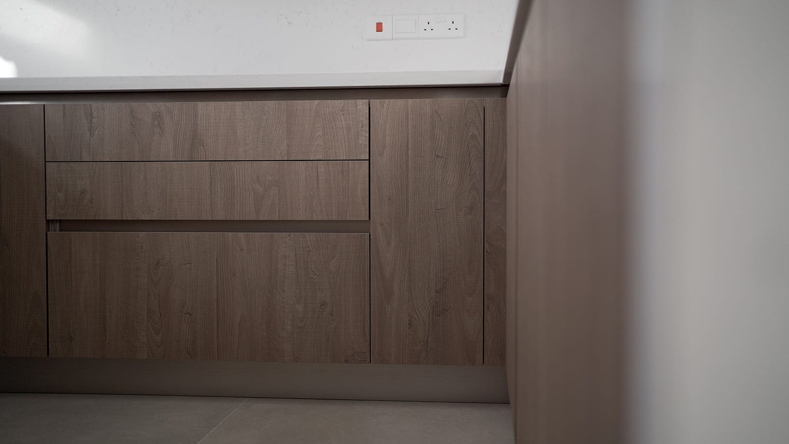 The distinctive wooden profile comes from the selection of Sharon thermo-structured matt melamine finishings in sherwood cognac and modern drawer systems, delivering a natural essence in the area, as it is completed by Kalea camelia matt finishings