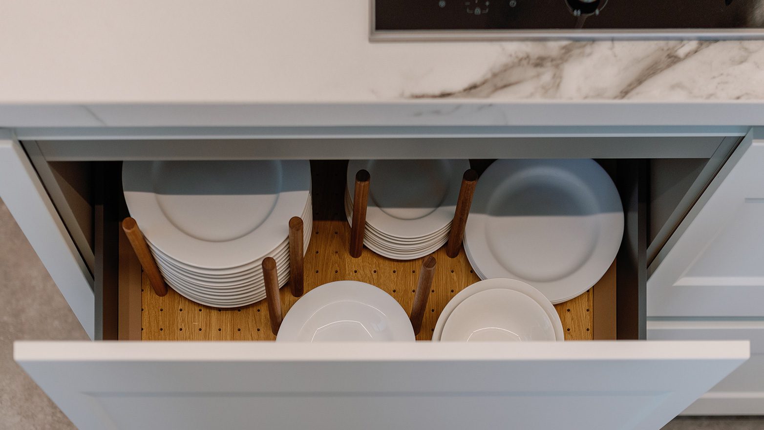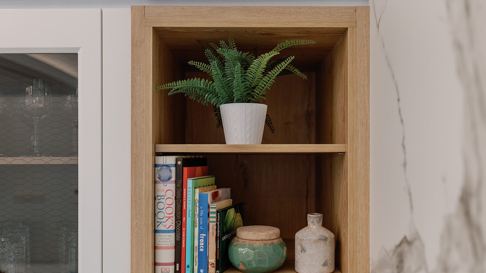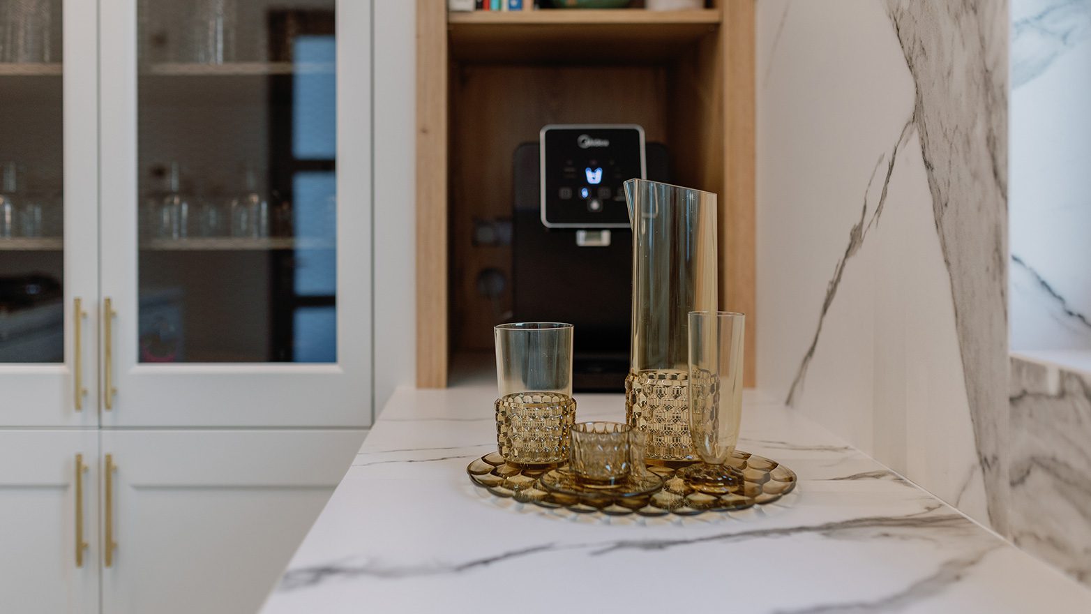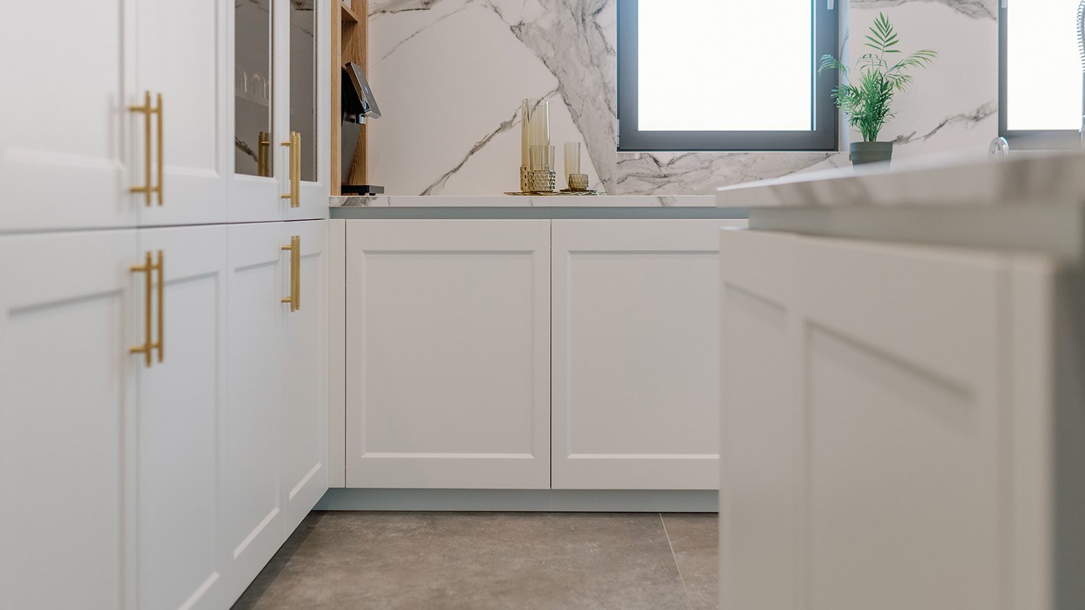 The addition of brass handles makes for a classy and elegant detail that enhances the overall effect of the white kitchen. While, different elements in light wood embrace a natural feel in the everyday environment.