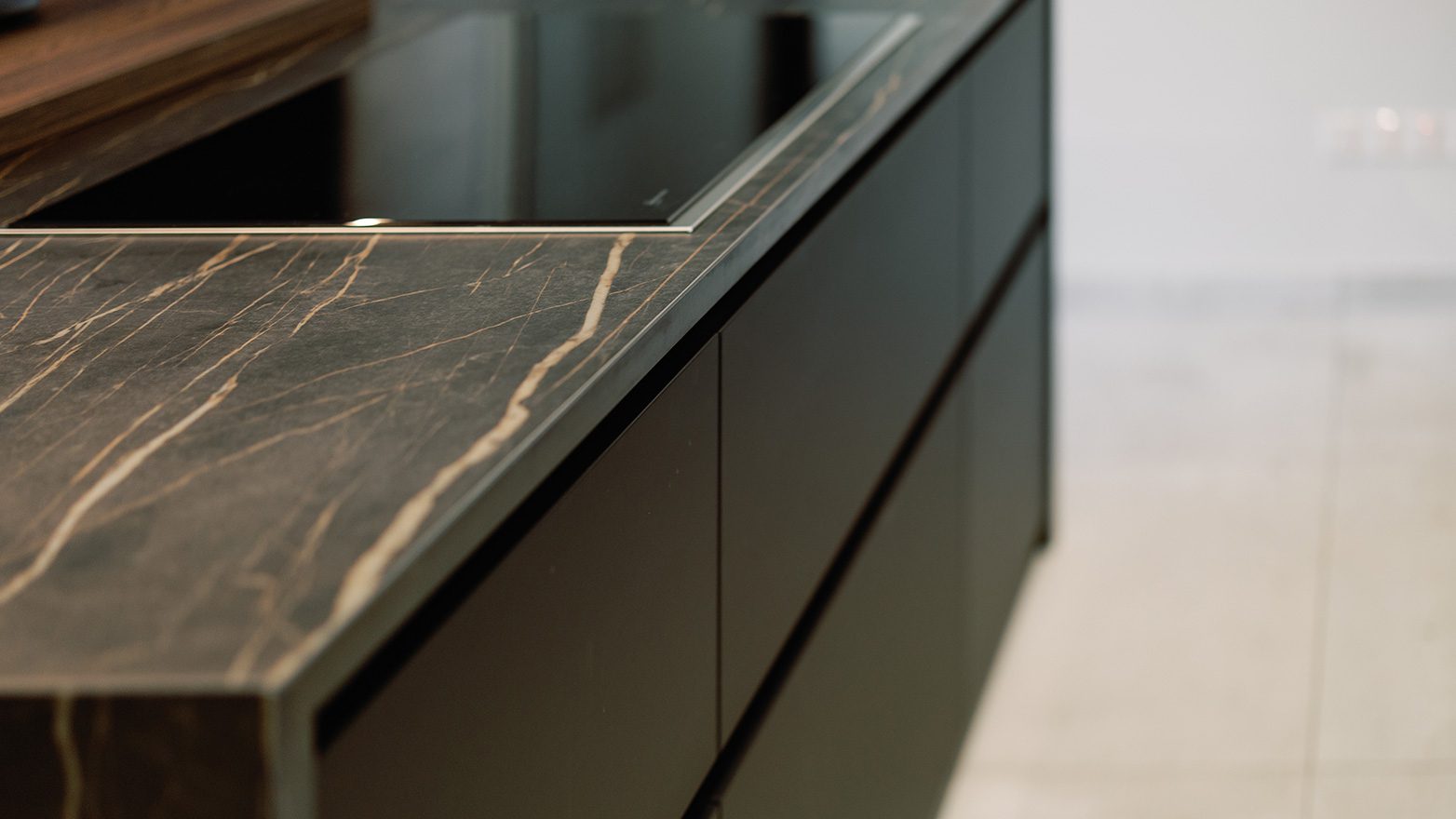 Whereas, the Kalea kitchen island module and assisting upper cabinets can be identified by a matt black finish.