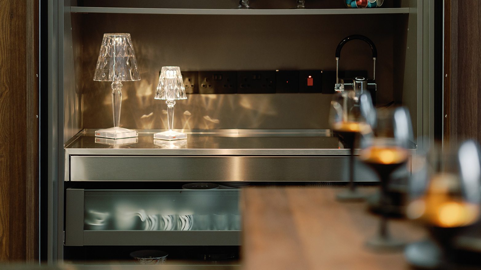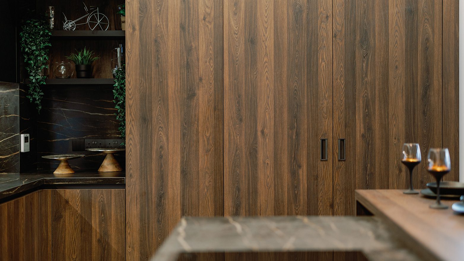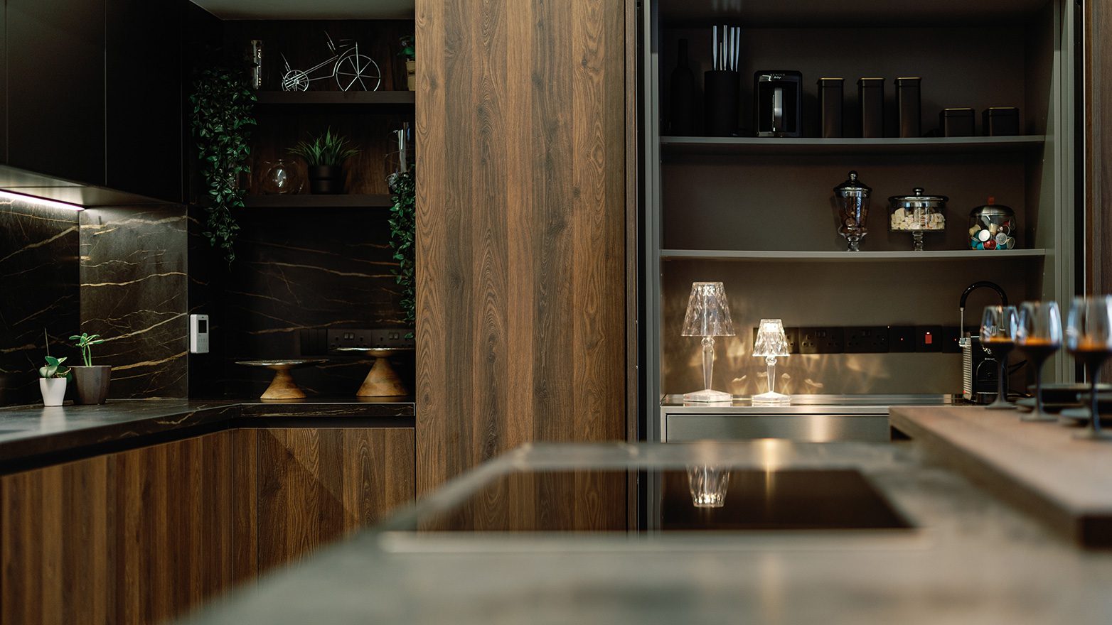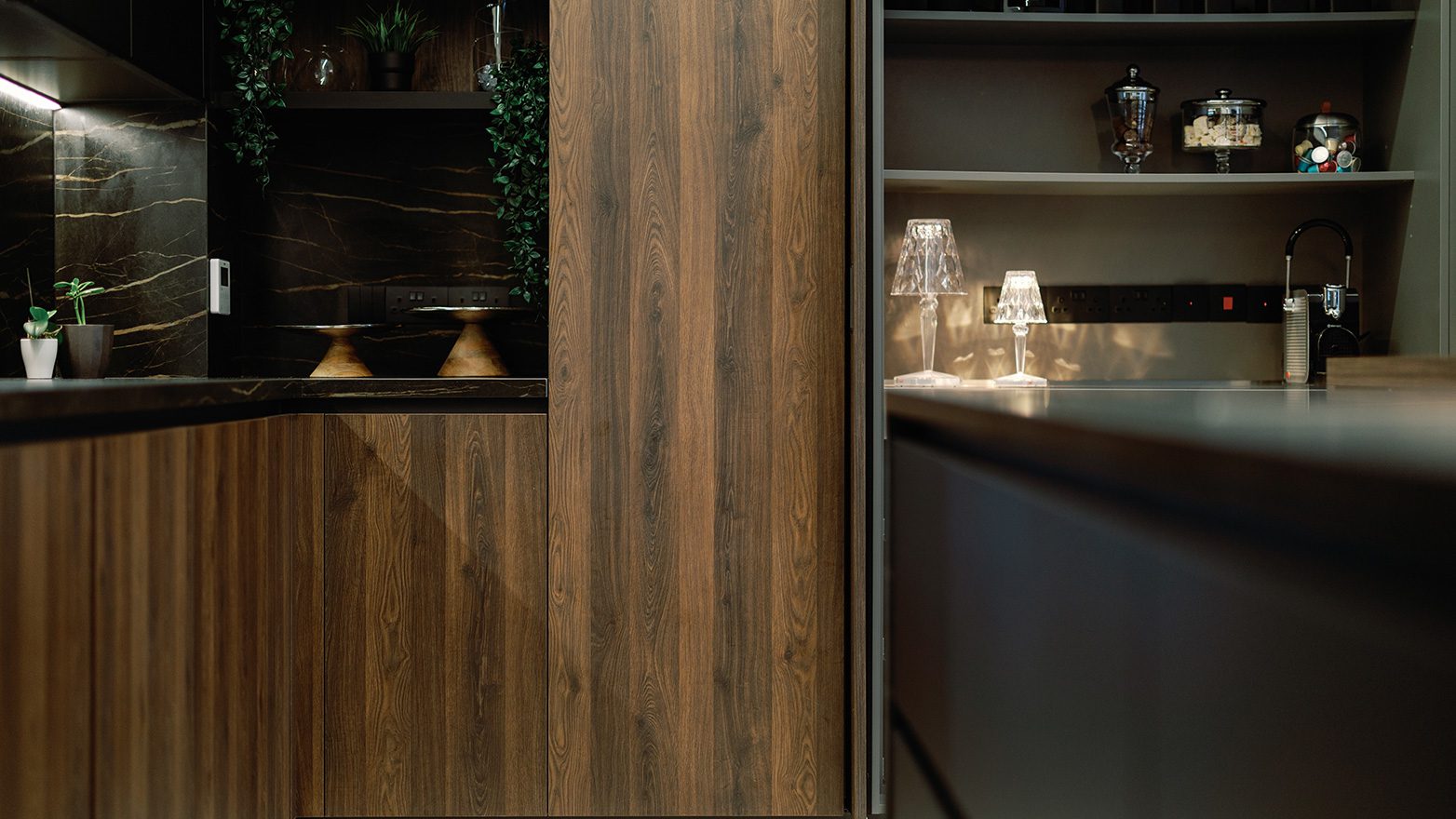 In detail, peripheral modules and the storage cabinet with pocket doors, are developed with Sharon in a dark tone, matt wood finish.
