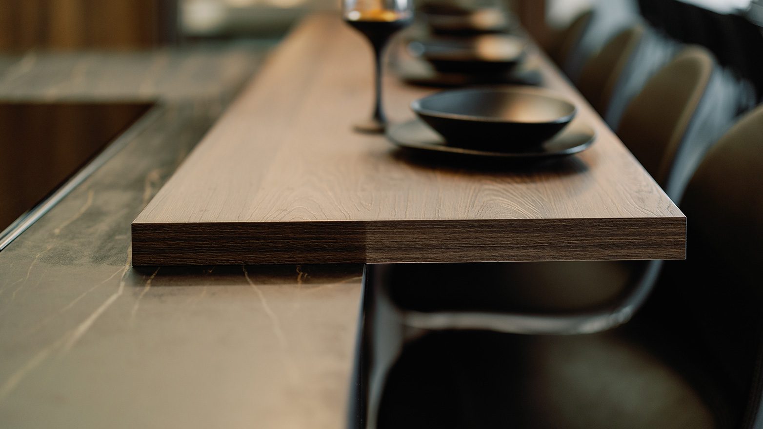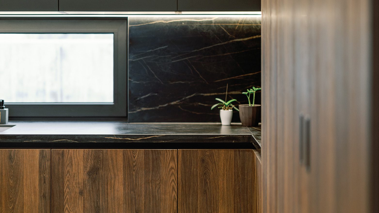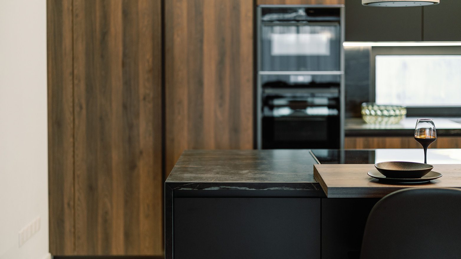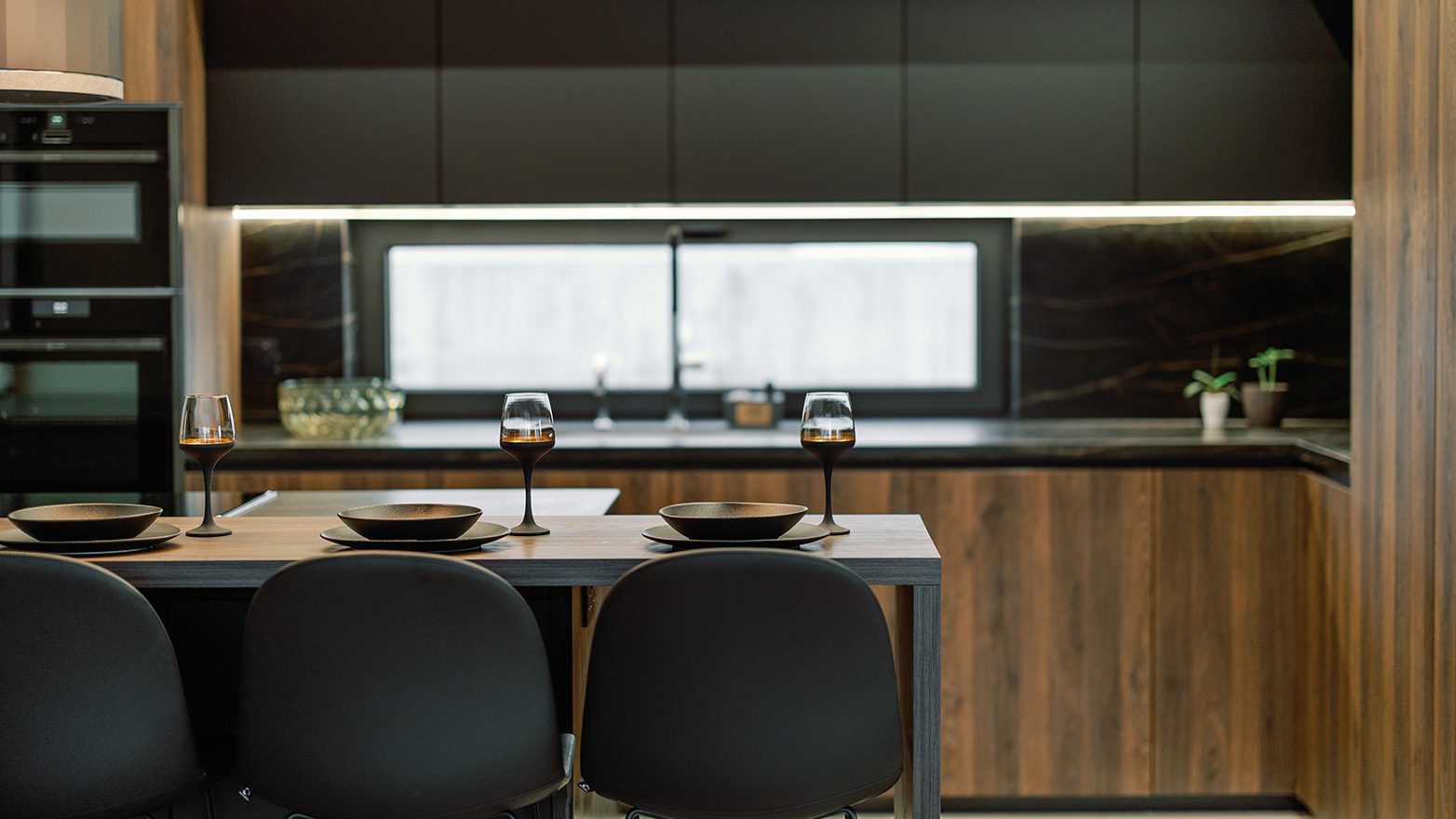 Natural elements, different textures, and bold features define the aesthetics – while the kitchen design adapts a linear approach with clean horizontal lines.