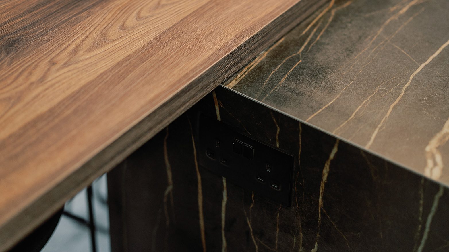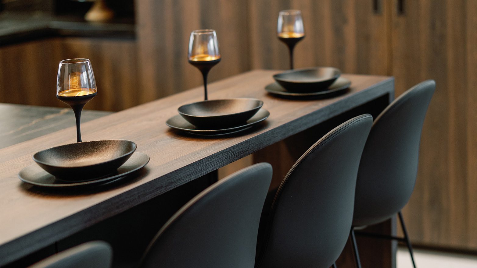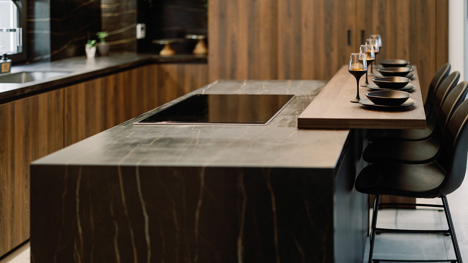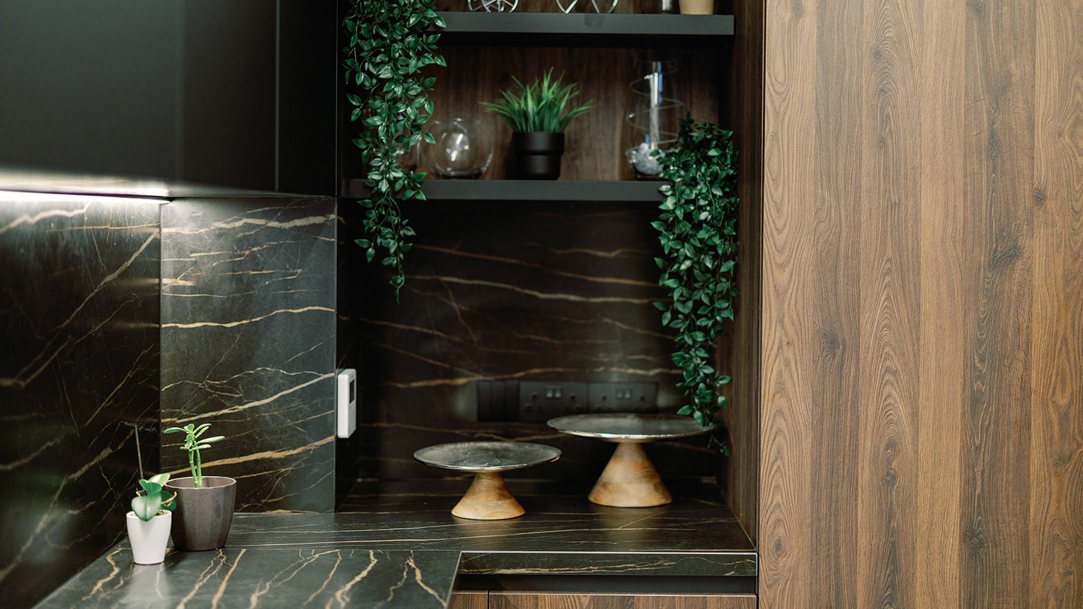 Natural elements, different textures, and bold features define the aesthetics – while the kitchen design adapts a linear approach with clean horizontal lines.