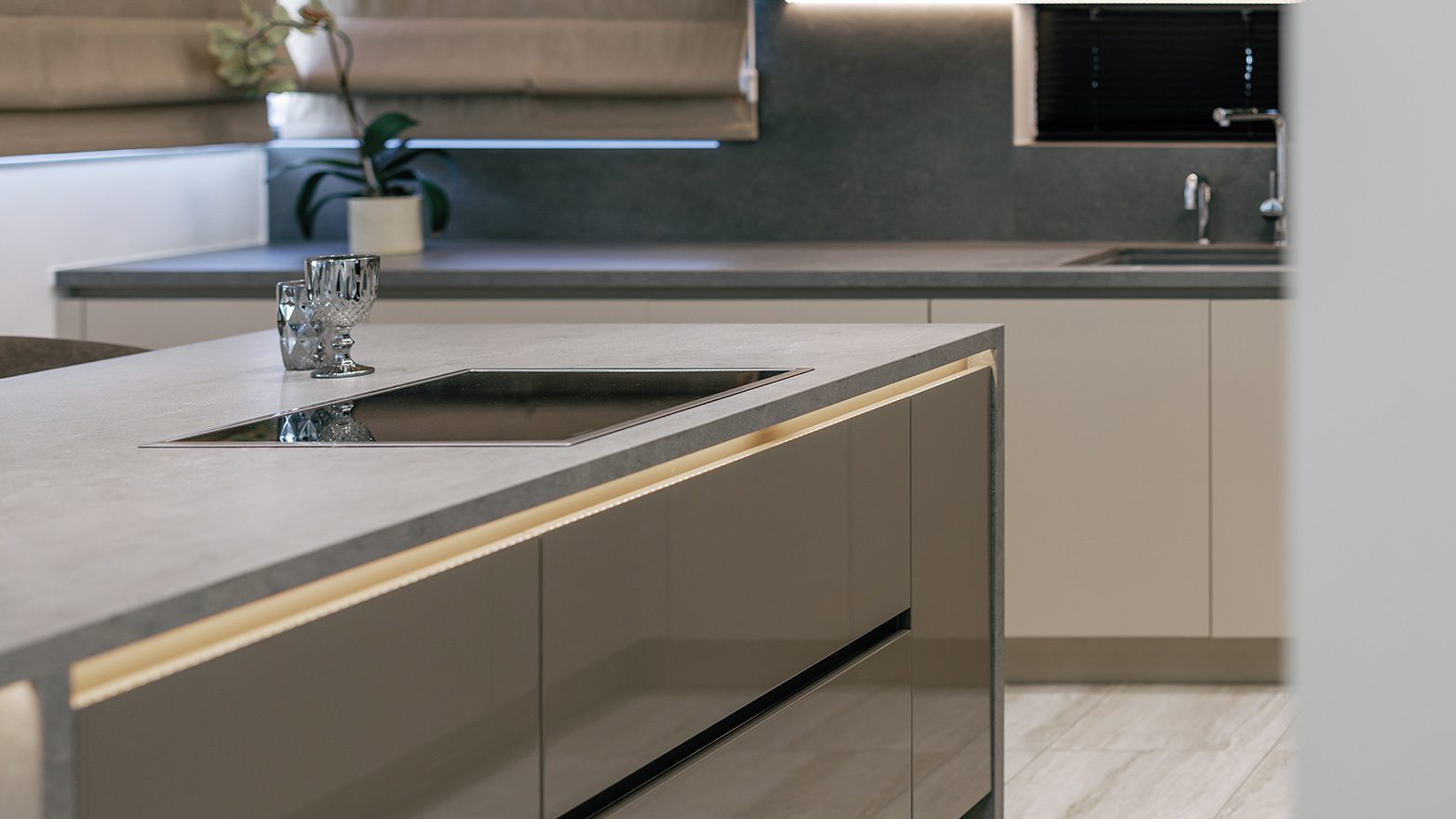 In a closer look, peripheral and assisting units in smooth, tortora matt colour finish, with System Kappa opening groove; featuring an integrated, stationary unit with pocket door. The kitchen island completes the composition, created with a gloss polymeric cabinet profile, caffè lucido in colour finish.