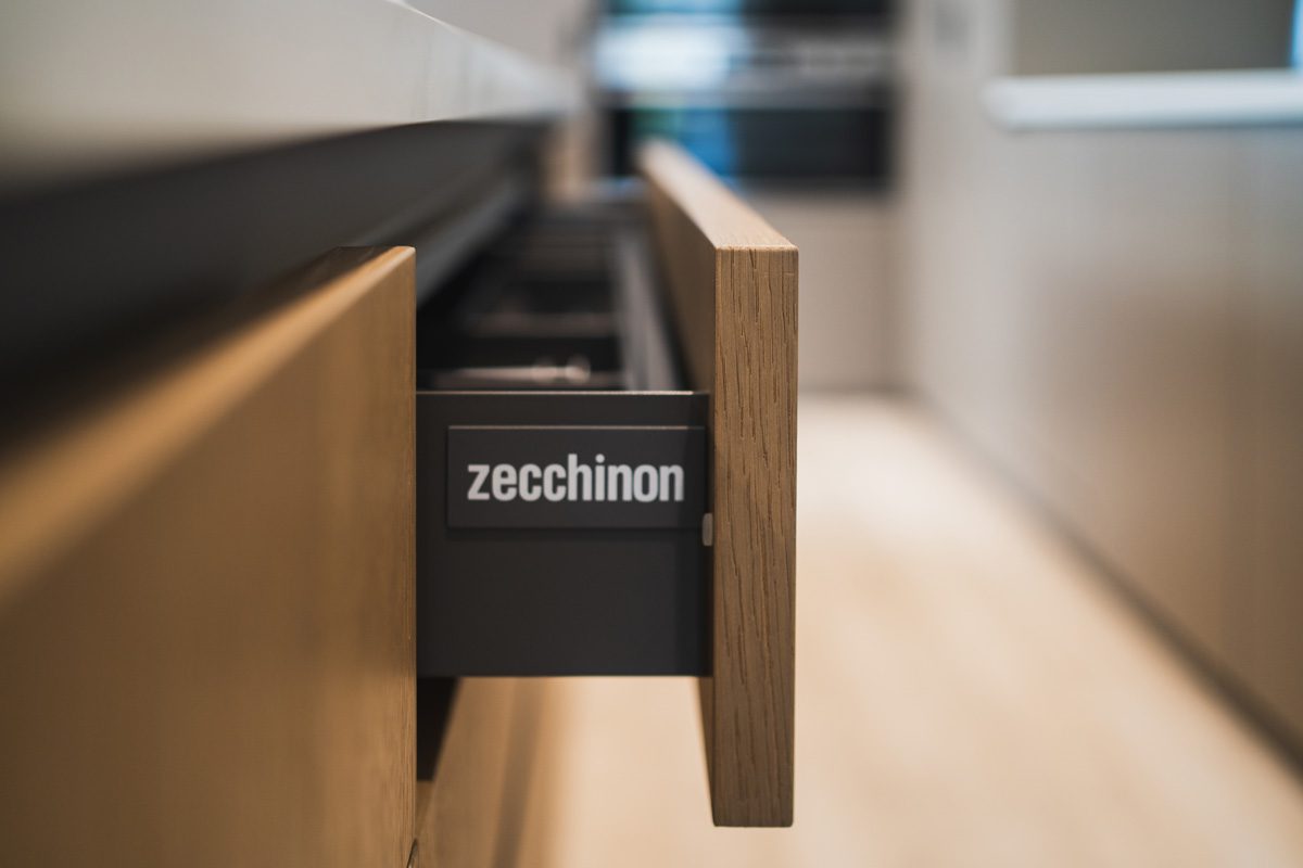 Modules in the kitchen counter and peripherally are developed with Zecchinon Cucine Kalea model in smooth black matt finish, paying special attention in practicality and functionality.