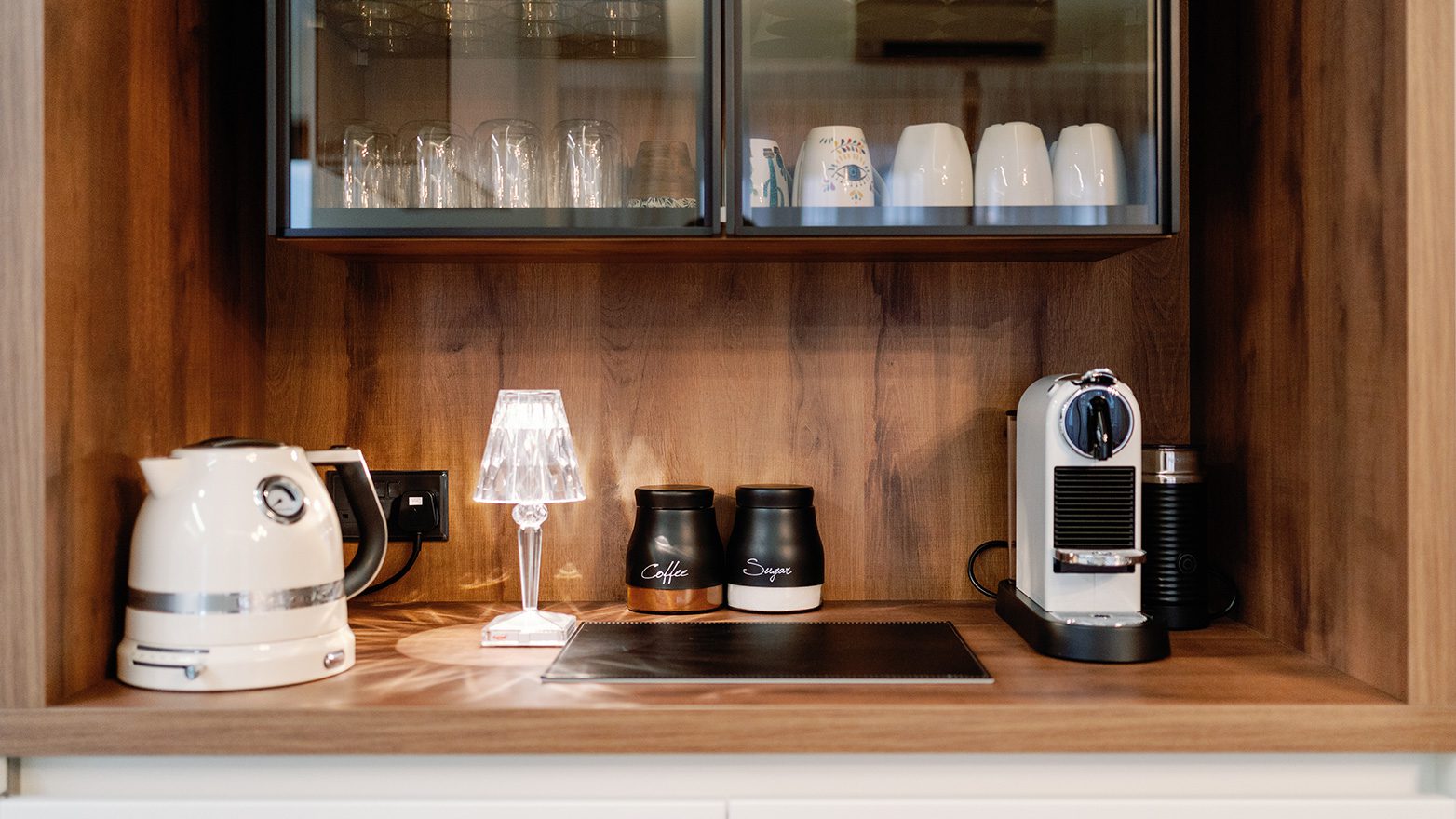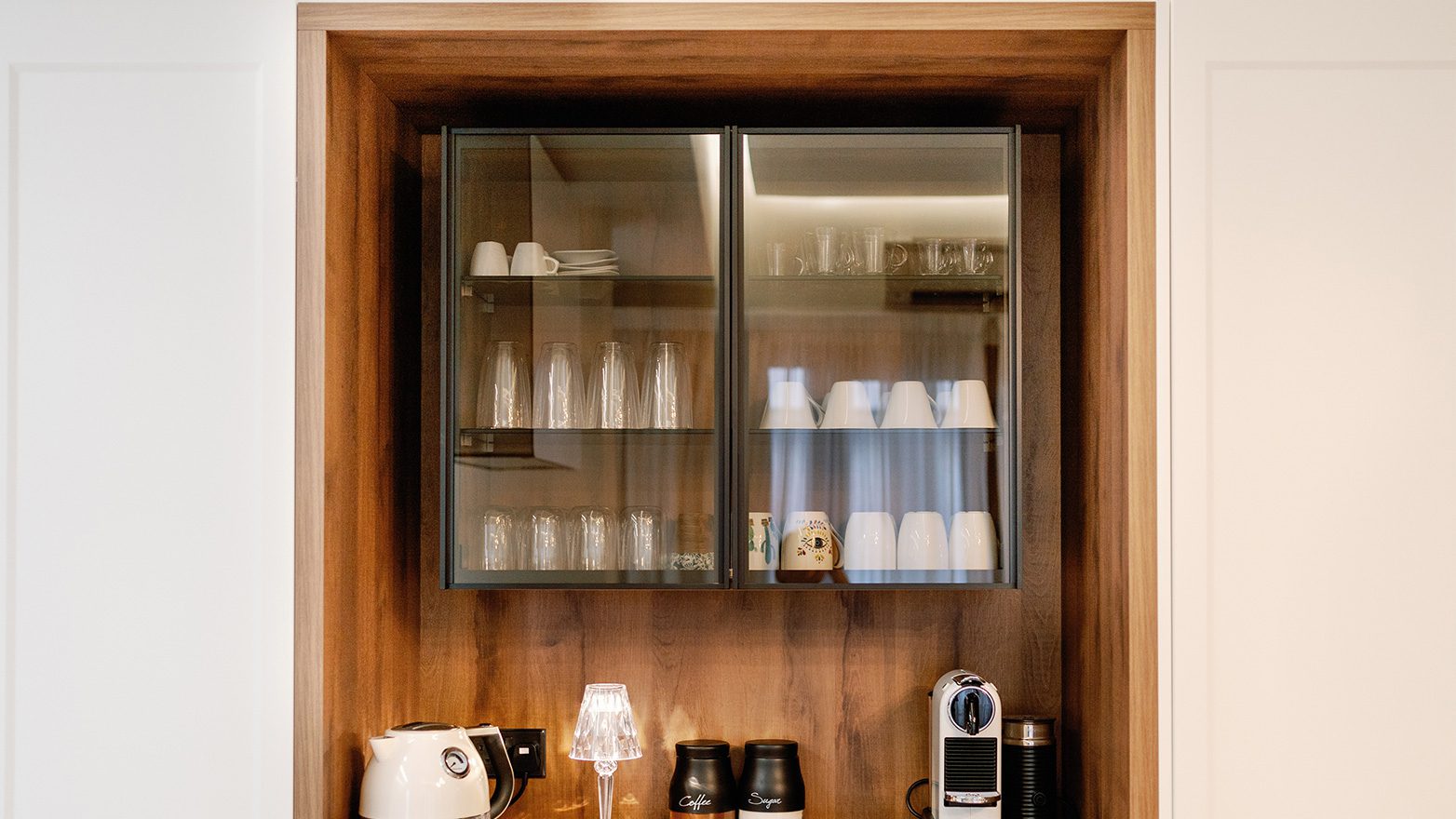 The nature-themed details have been created with the native oak finish, like the open element that serves as a coffee station, developed with smoked glass panels to take in glassware, coffee cups, and essentials.