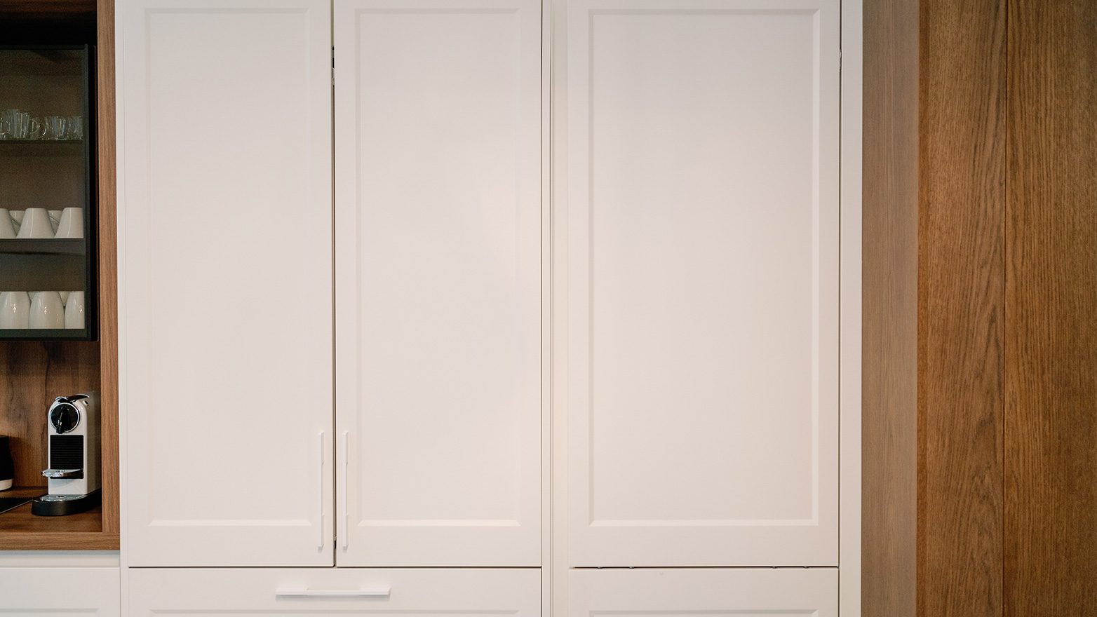 Taking a closer look at the synthesis – peripheral and upper modules in matt white finish have been developed with theGruppo Euromobil Filò model, offering aesthetic expression and a practical solution, while a suspended island hood has been installed to accommodate any type of cooking session.