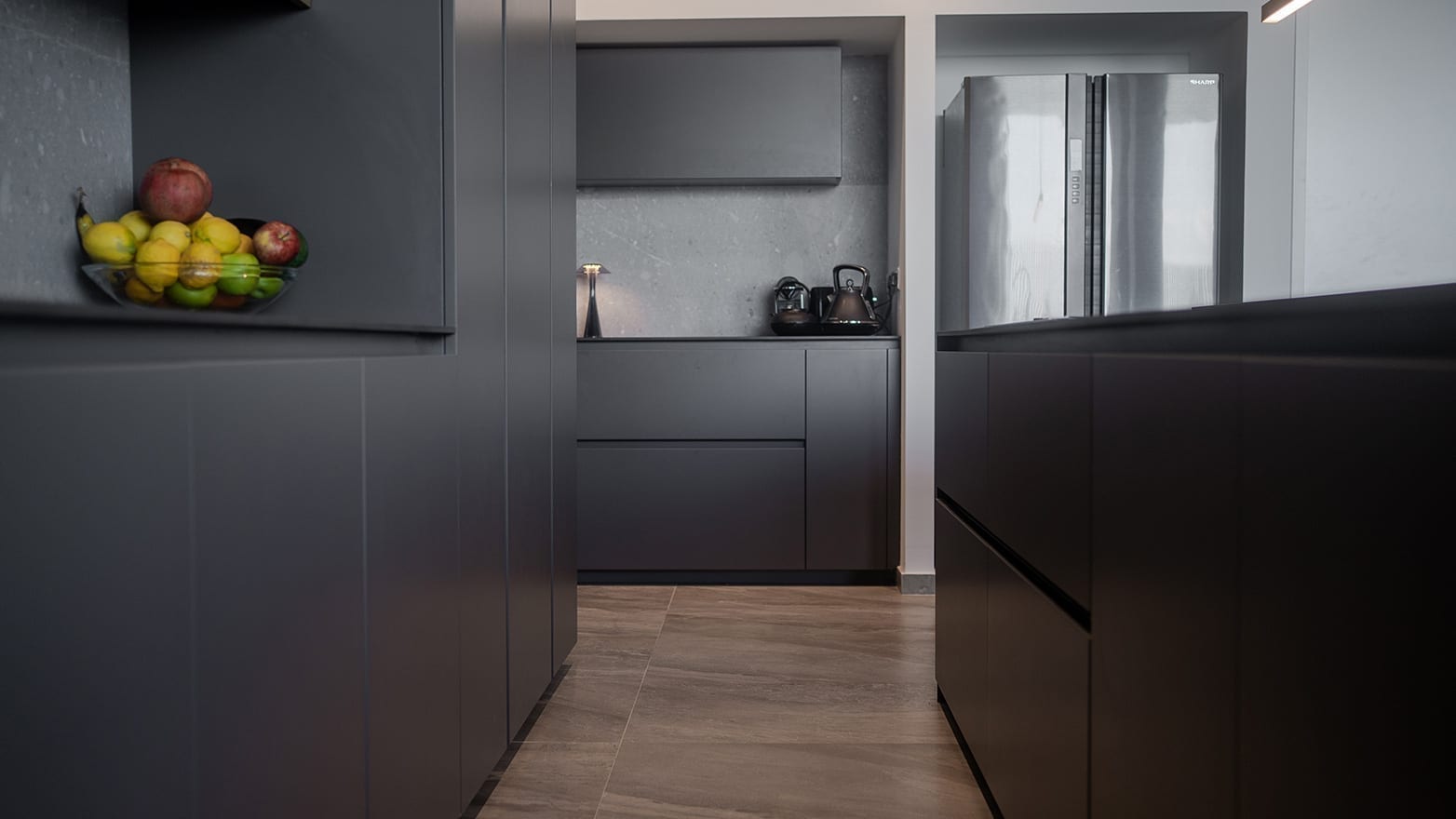 Zecchinon Cucine’s K105 and System Kappa provided the basis for the development, in the process of creating the kitchen modules with lacquered mdf in anthracite finish.