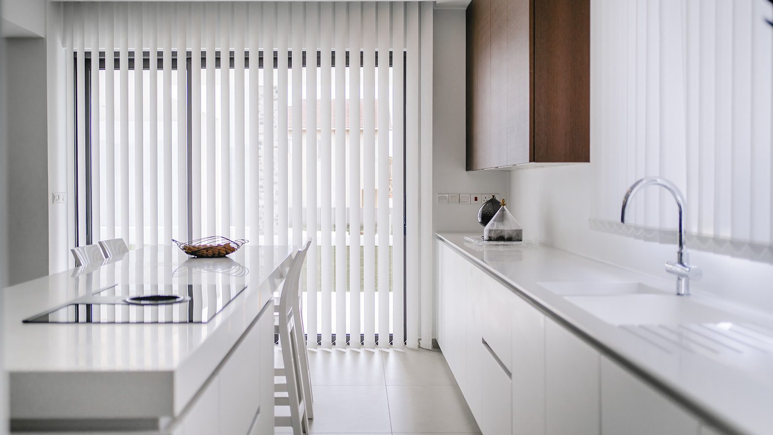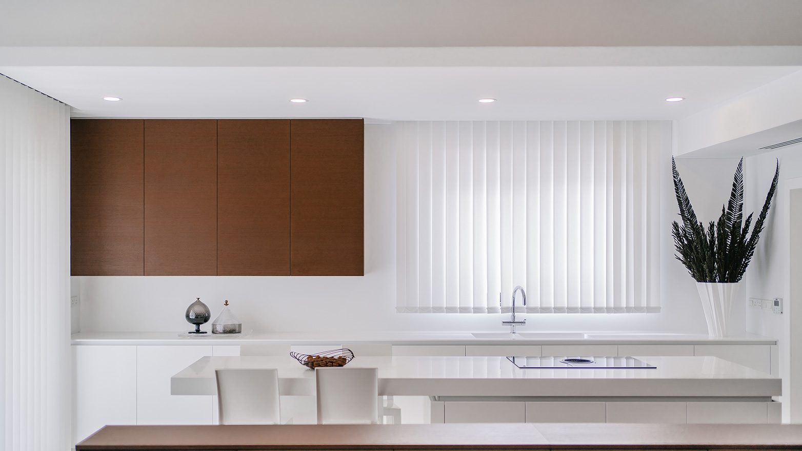 The kitchen is developed with two distinguished models of Zecchinon Cucine; Kalea is selected in milky white matt finish for the back wall area and central, kitchen island, while at the forefront service area and for the upper assistive units tobacco oak modules are designed in approach of an intimate, naturalistic style.
