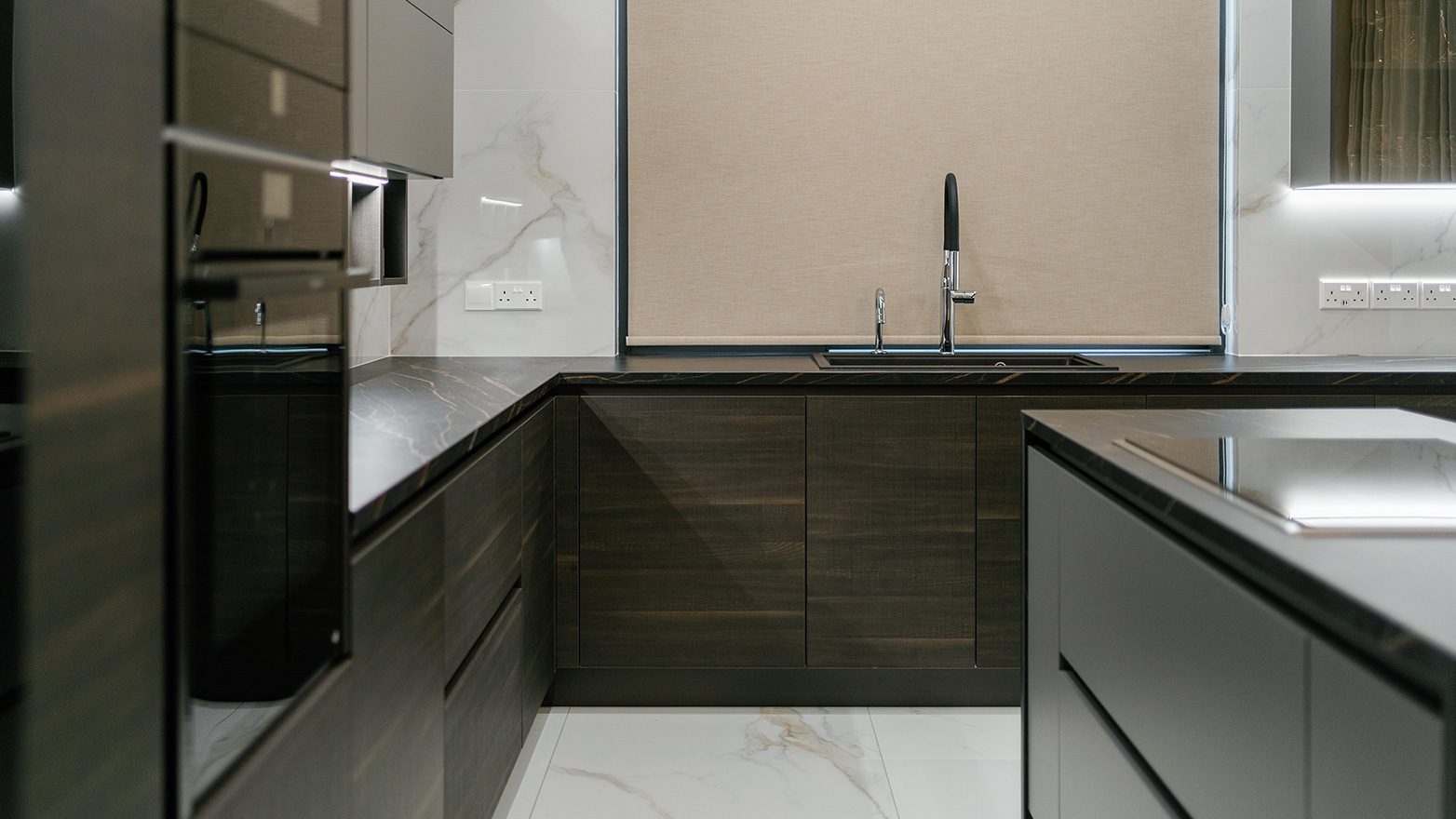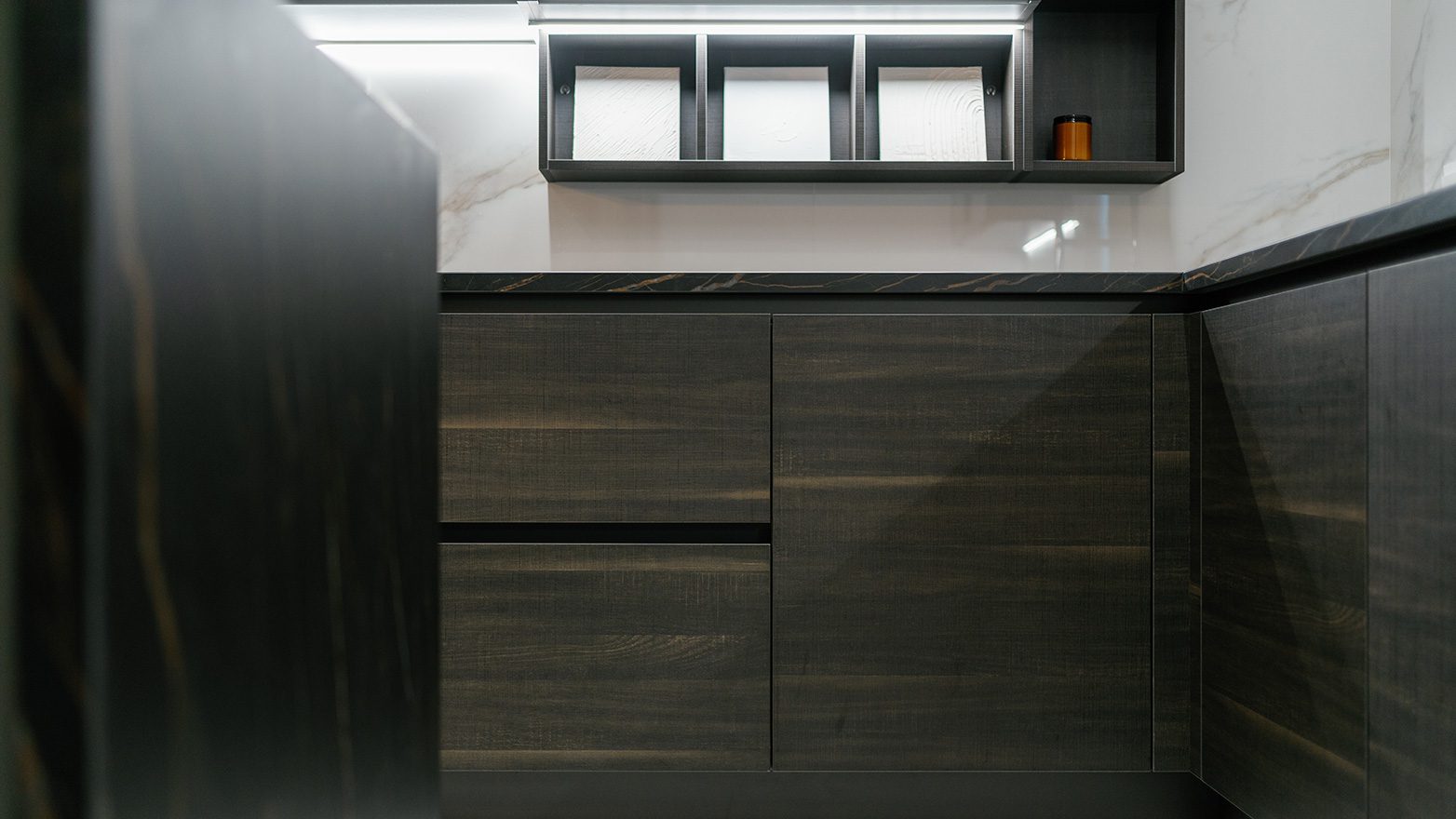 Taking a closer look, peripheral assisting units are developed with melamine in wooden effect, Rovere Torba finish, while the units above the counter area are matched with the kitchen island drawers, developed with smooth melamine in matt color, Grigio Onice finish.