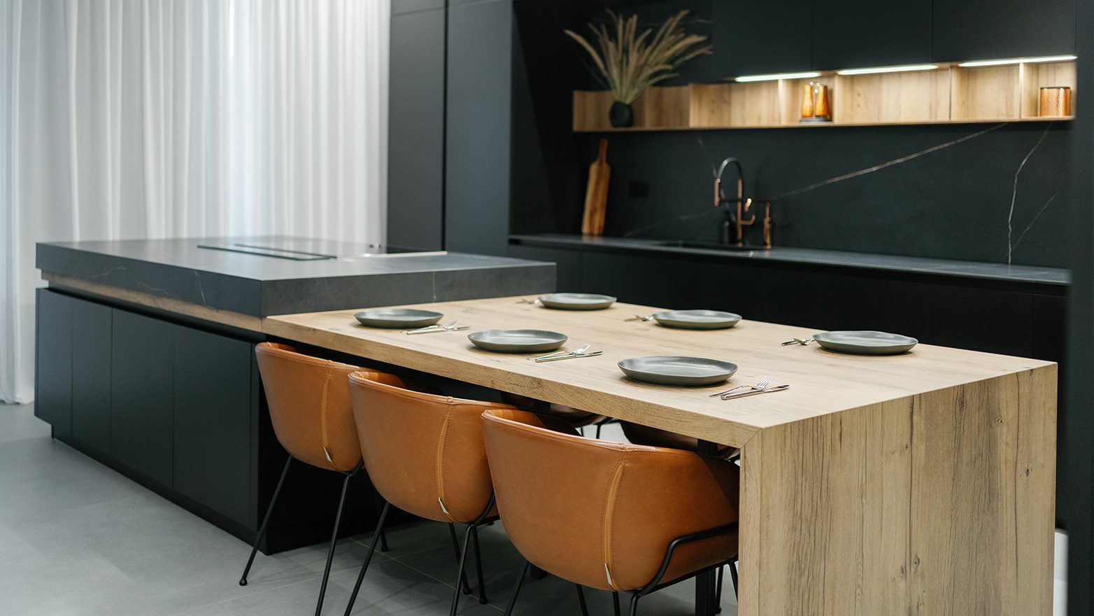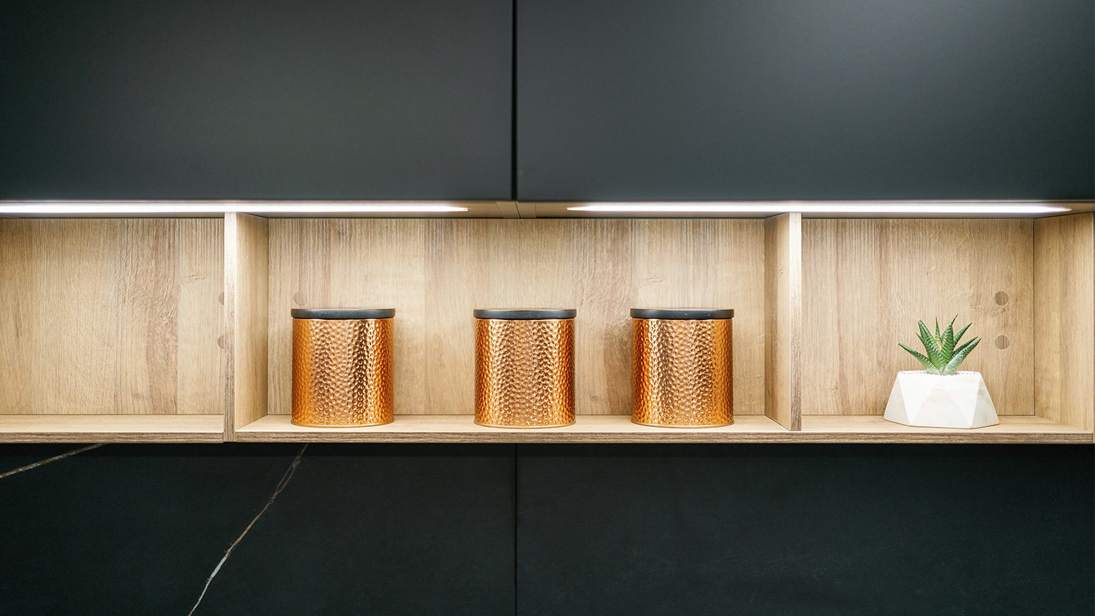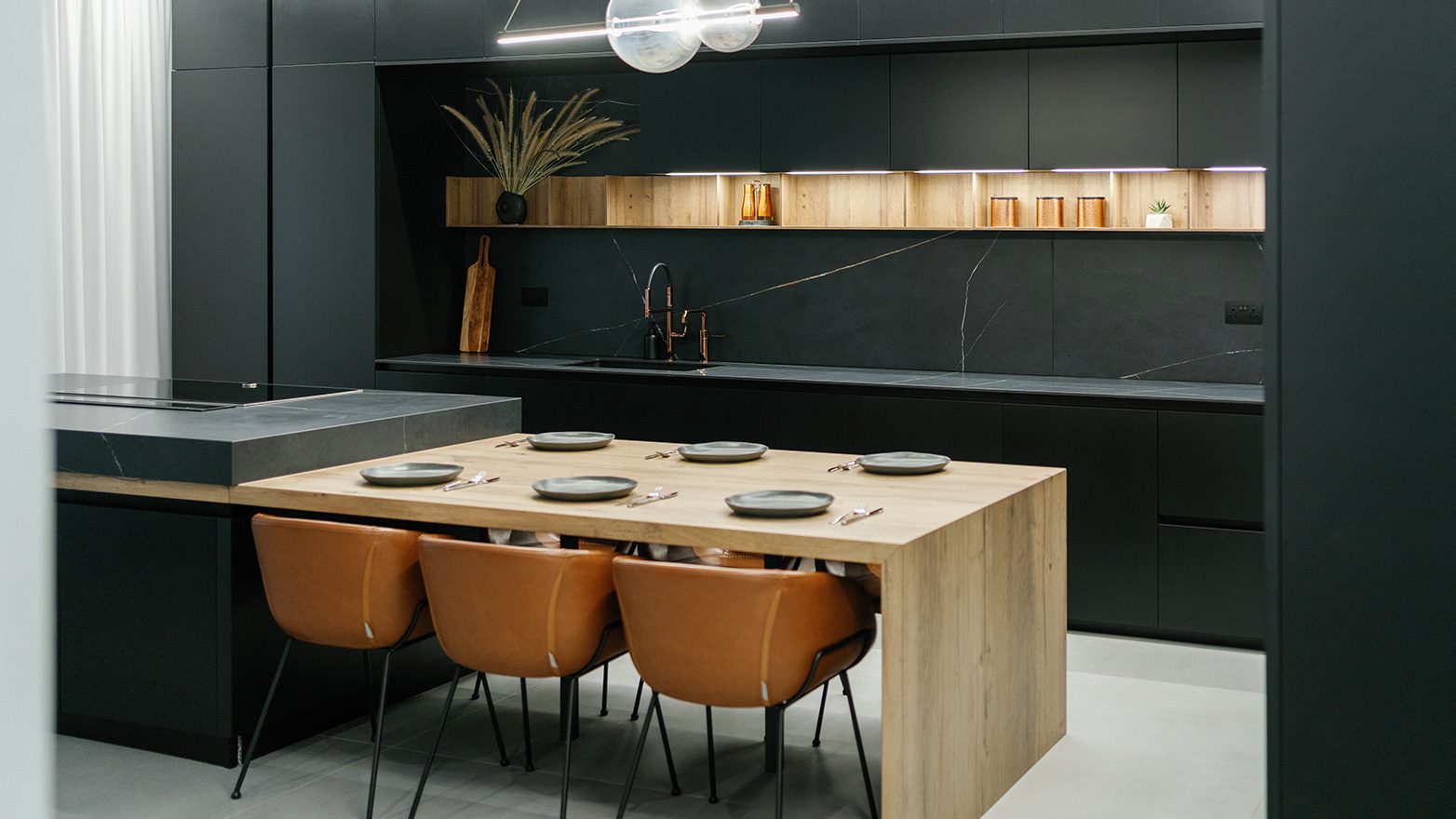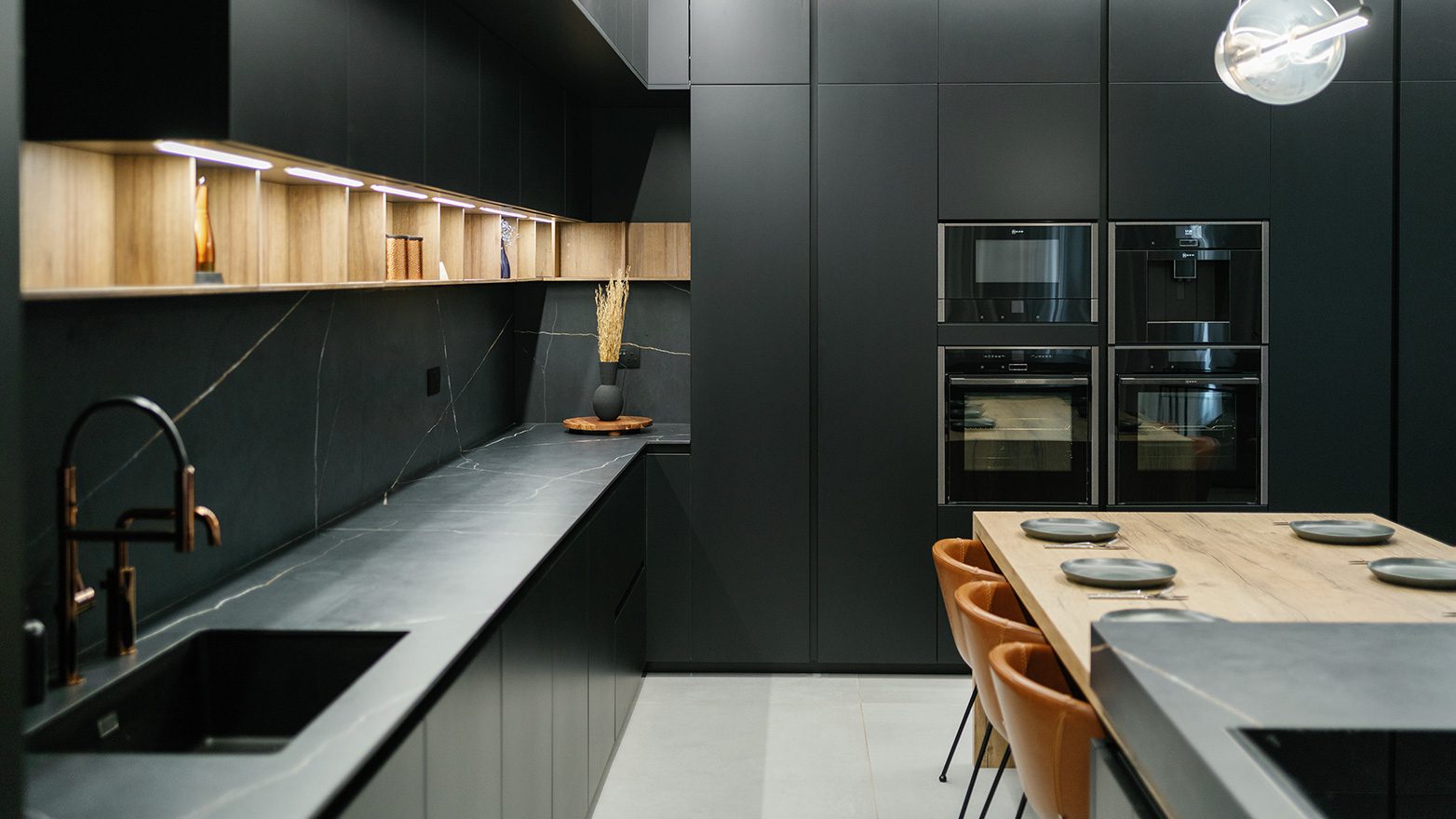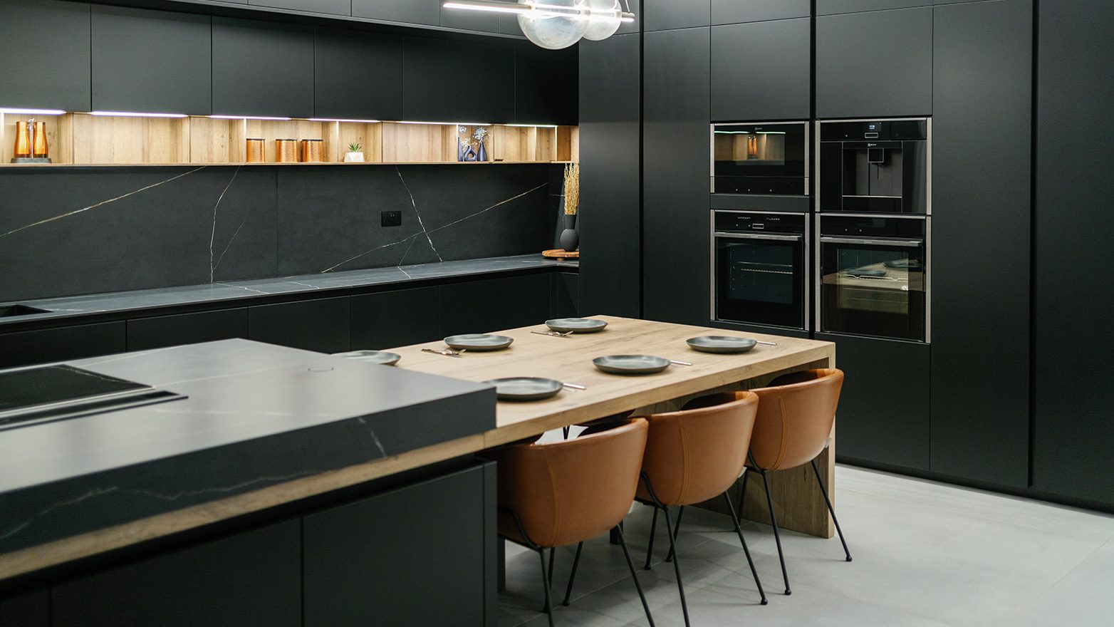 In a close-up, the black theme unveils around kitchen units with smooth eccolacato in matt colour finish, thus creating a minimalist style that playfully incorporates different textures and shades in its details.