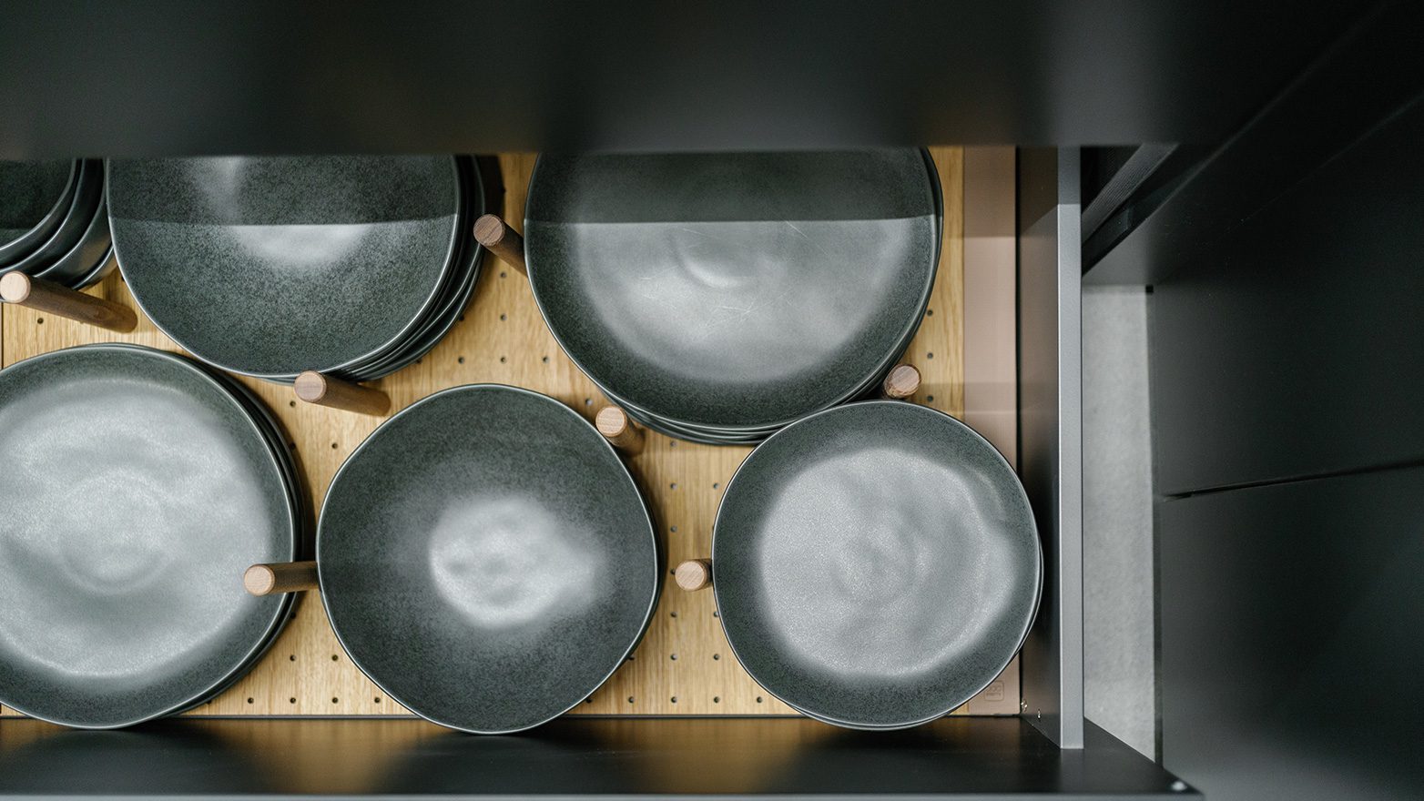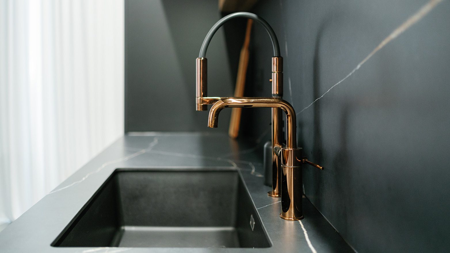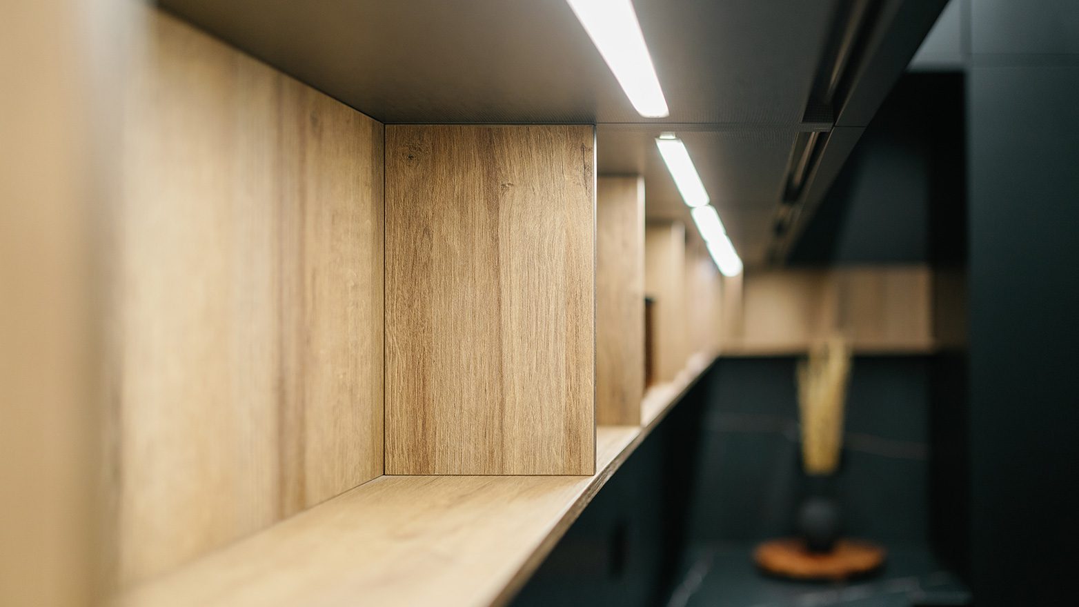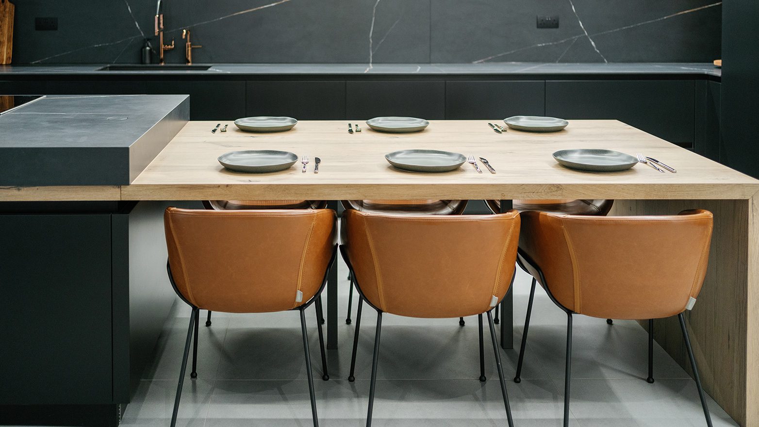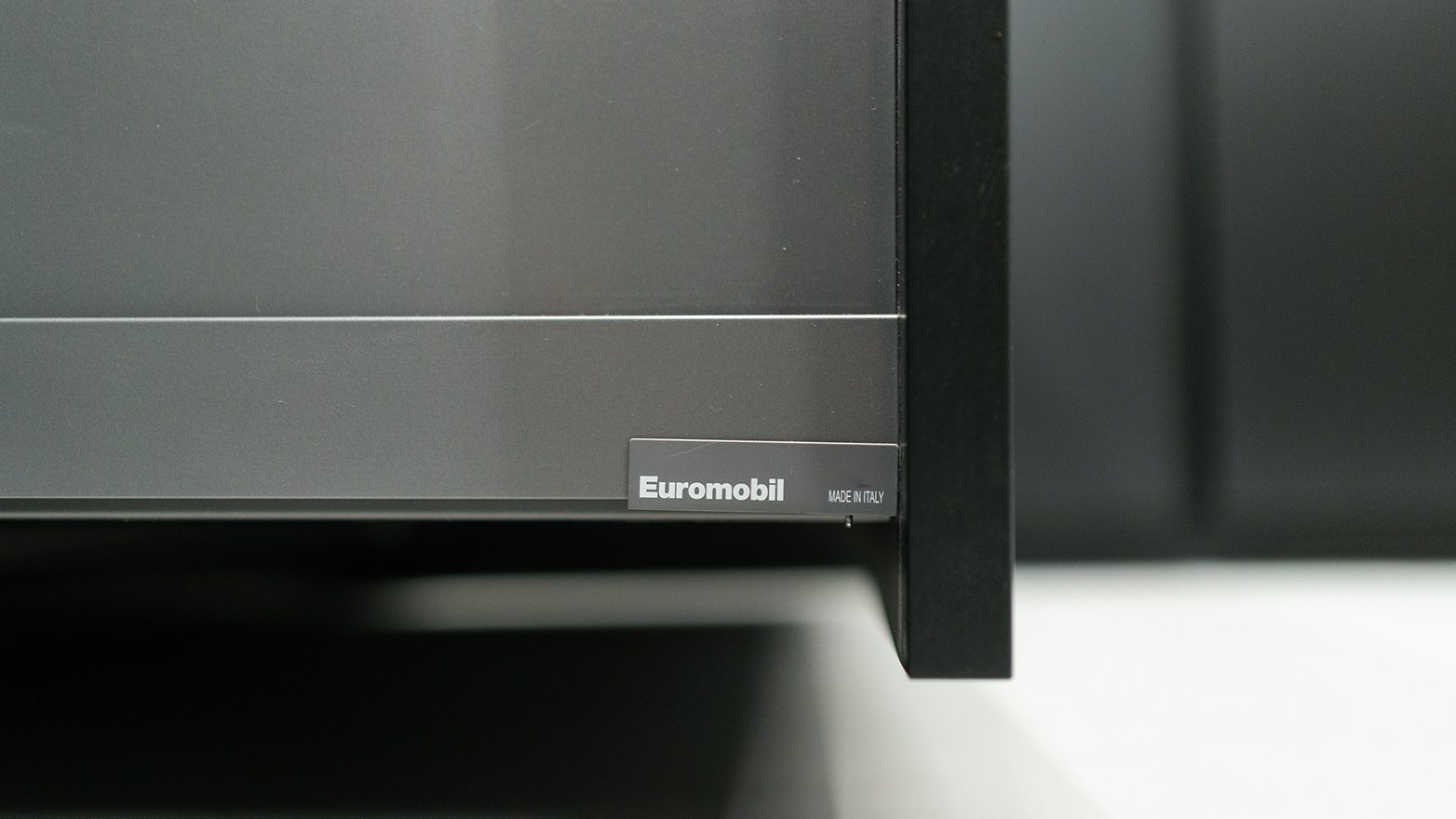 In a close-up, the black theme unveils around kitchen units with smooth eccolacato in matt colour finish, thus creating a minimalist style that playfully incorporates different textures and shades in its details.