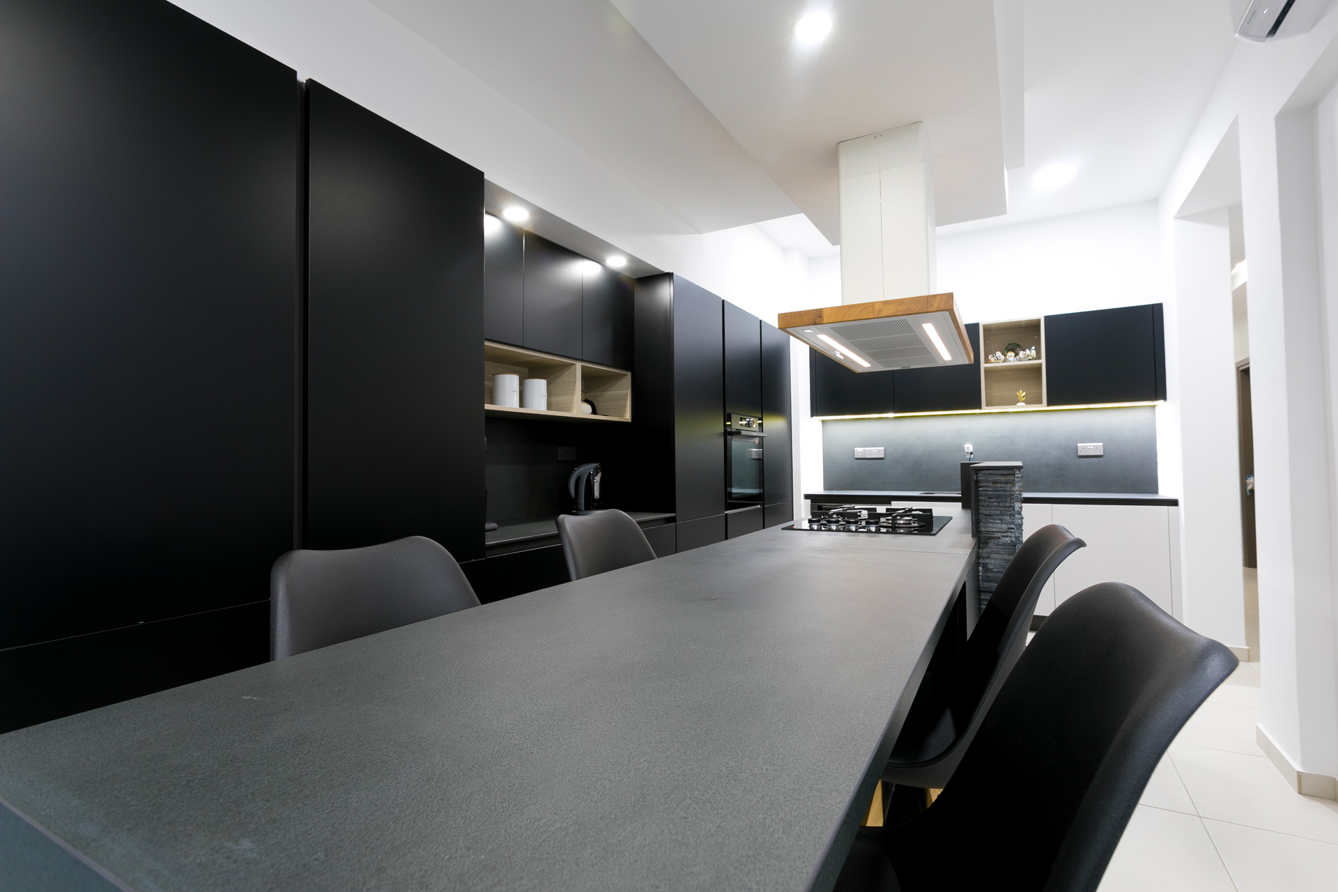 where the kitchen polymeric laminate surfaces create an exceptional ambiance due to the black chromatic synthesis of matt, nero matt and grigio set matt.