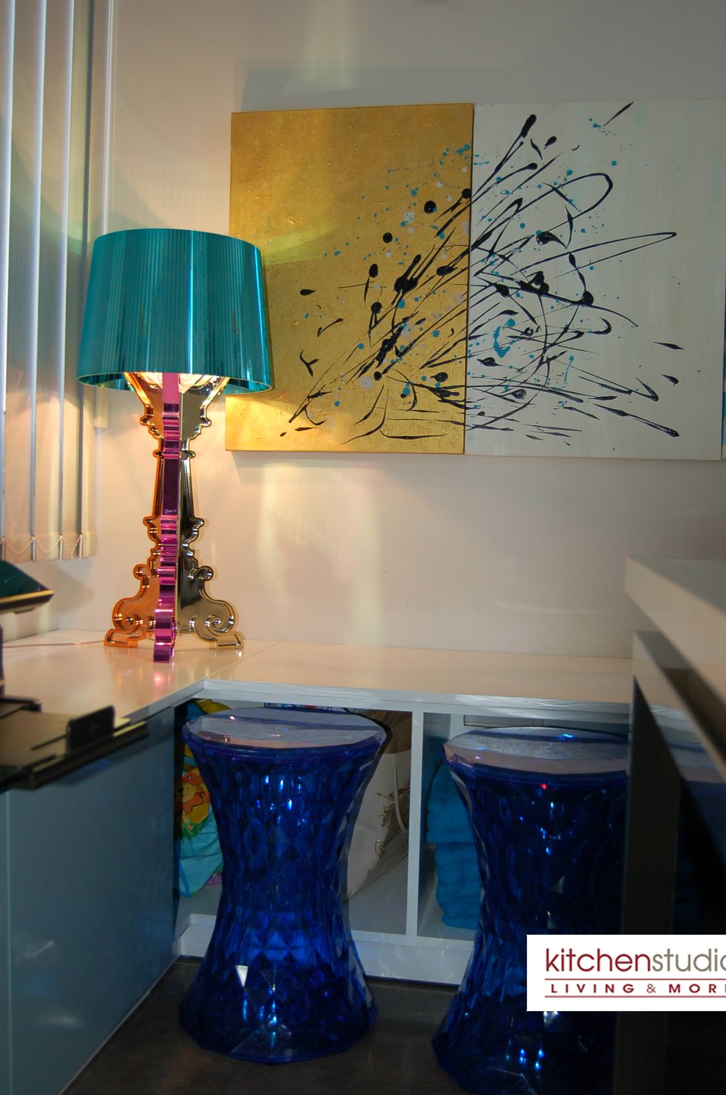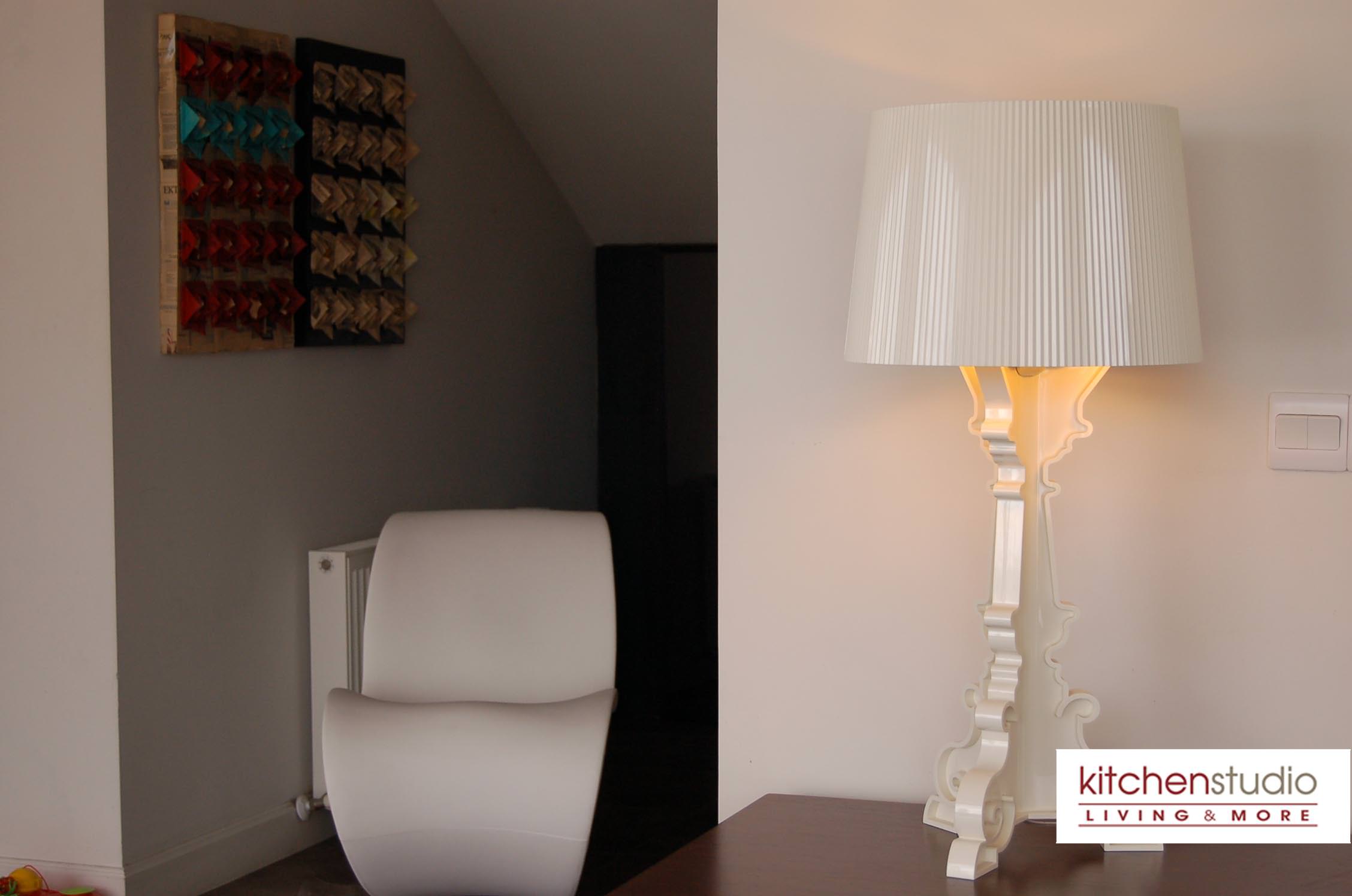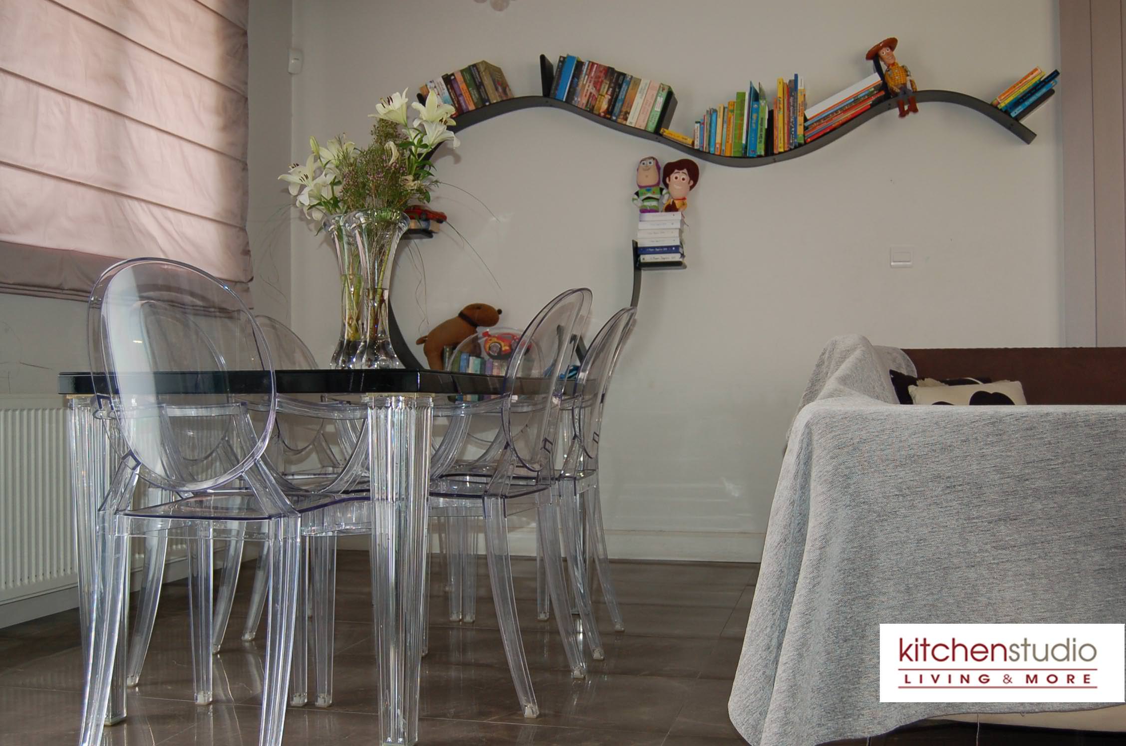 delivers perfectly the essence of modernity, while the crystal colored Sparkle stool by Kartell with the wooden floor, complete the sophisticated lounge area. Desiree’s Freemood sofa ( by Gruppo Euromobil) offers the flexibility and mobility you want in an open space,