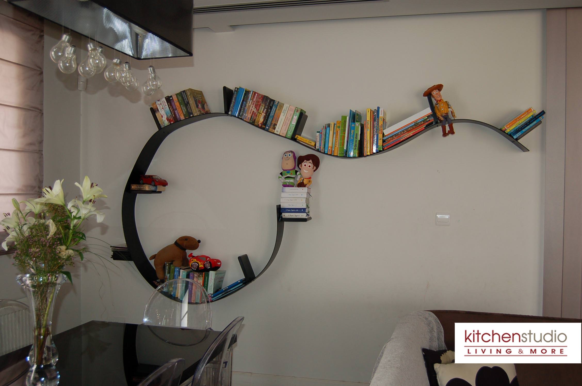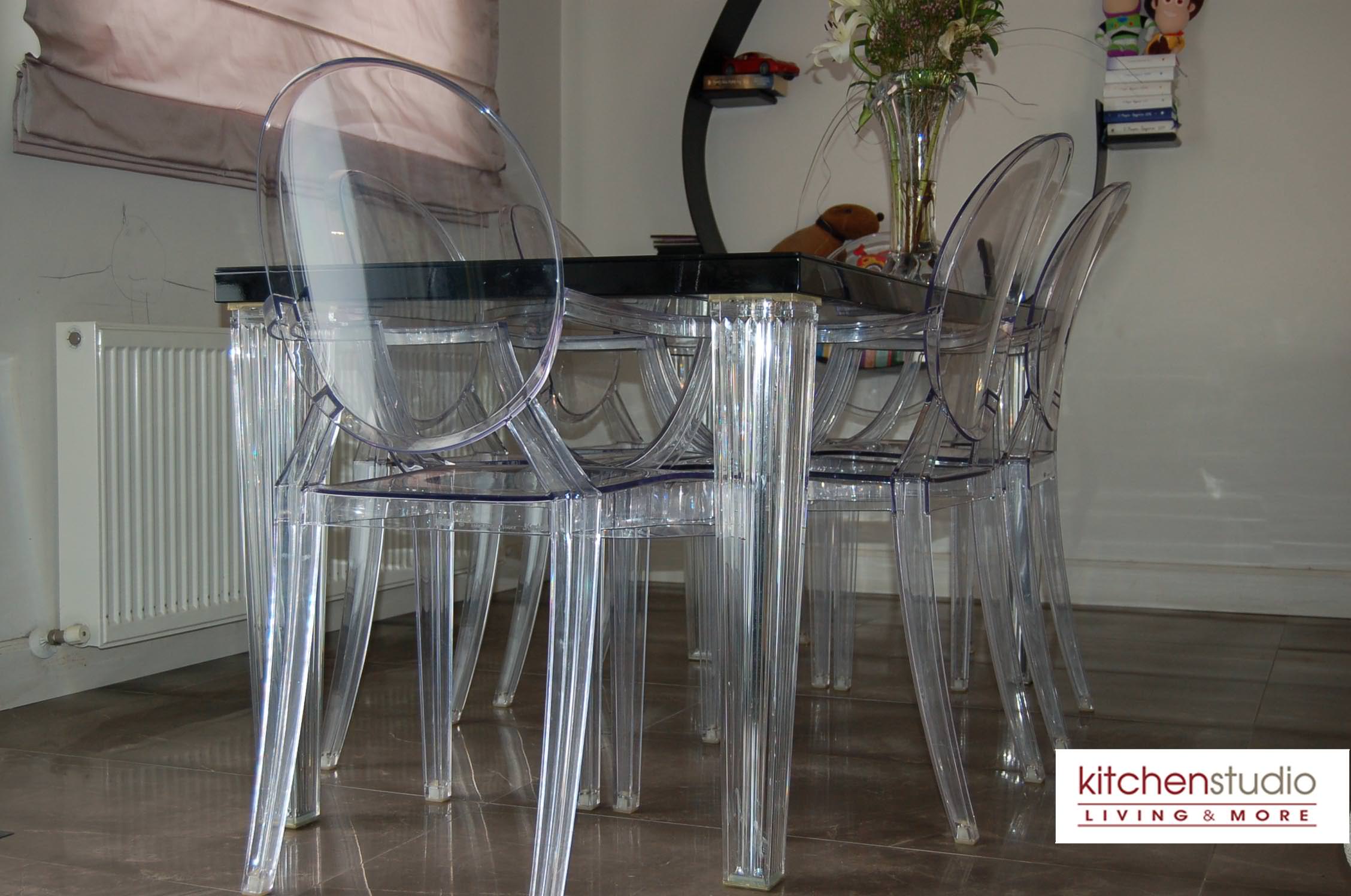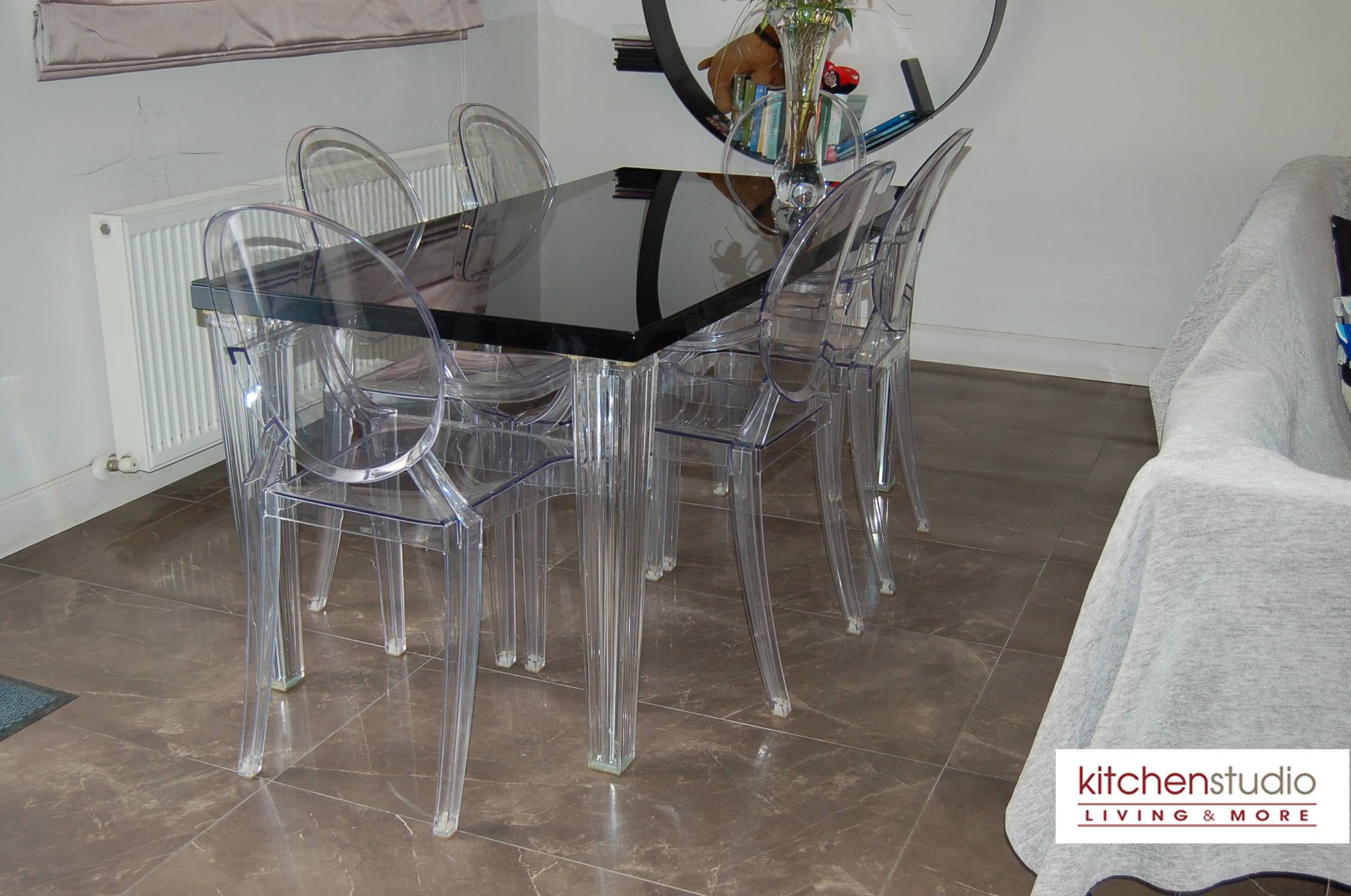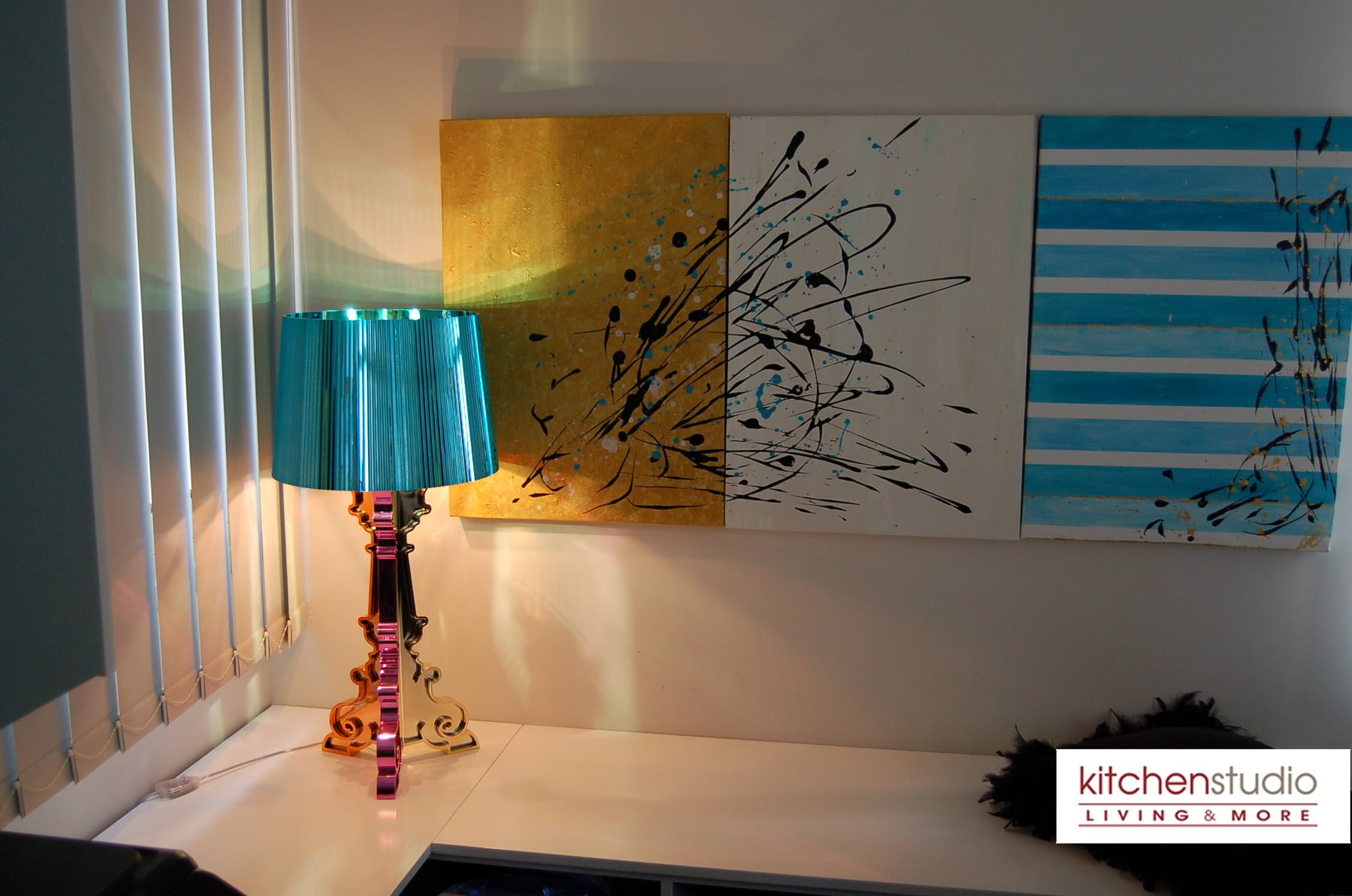 delivers perfectly the essence of modernity, while the crystal colored Sparkle stool by Kartell with the wooden floor, complete the sophisticated lounge area. Desiree’s Freemood sofa ( by Gruppo Euromobil) offers the flexibility and mobility you want in an open space,