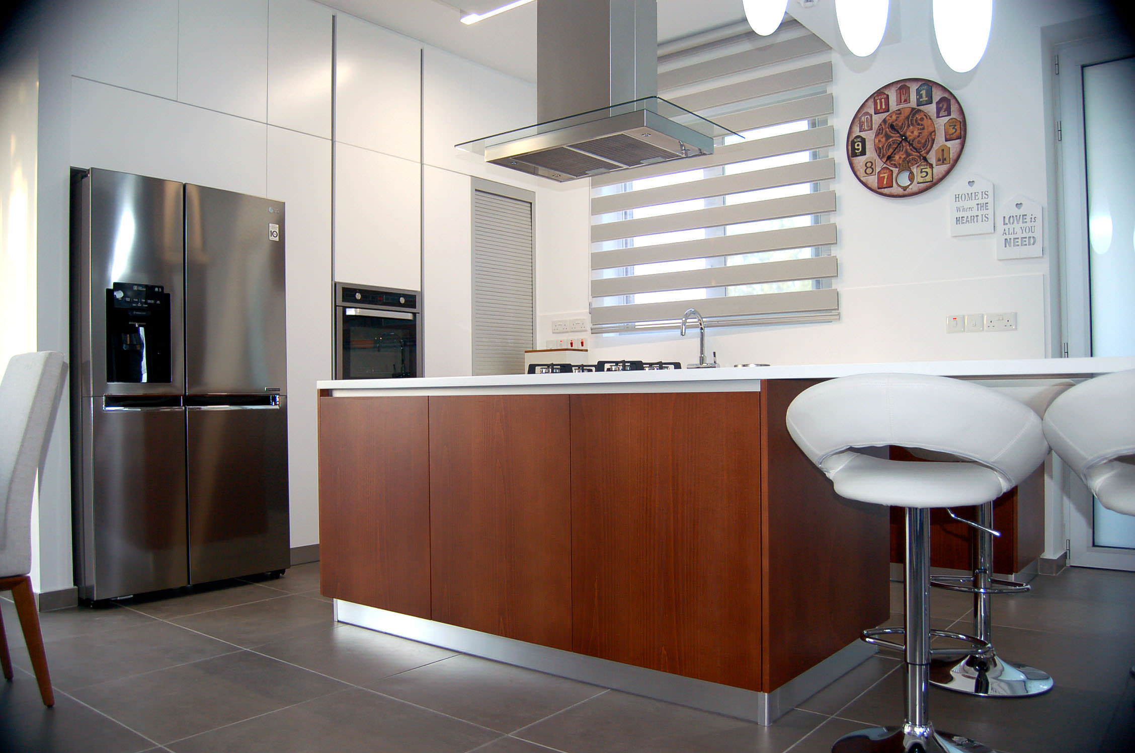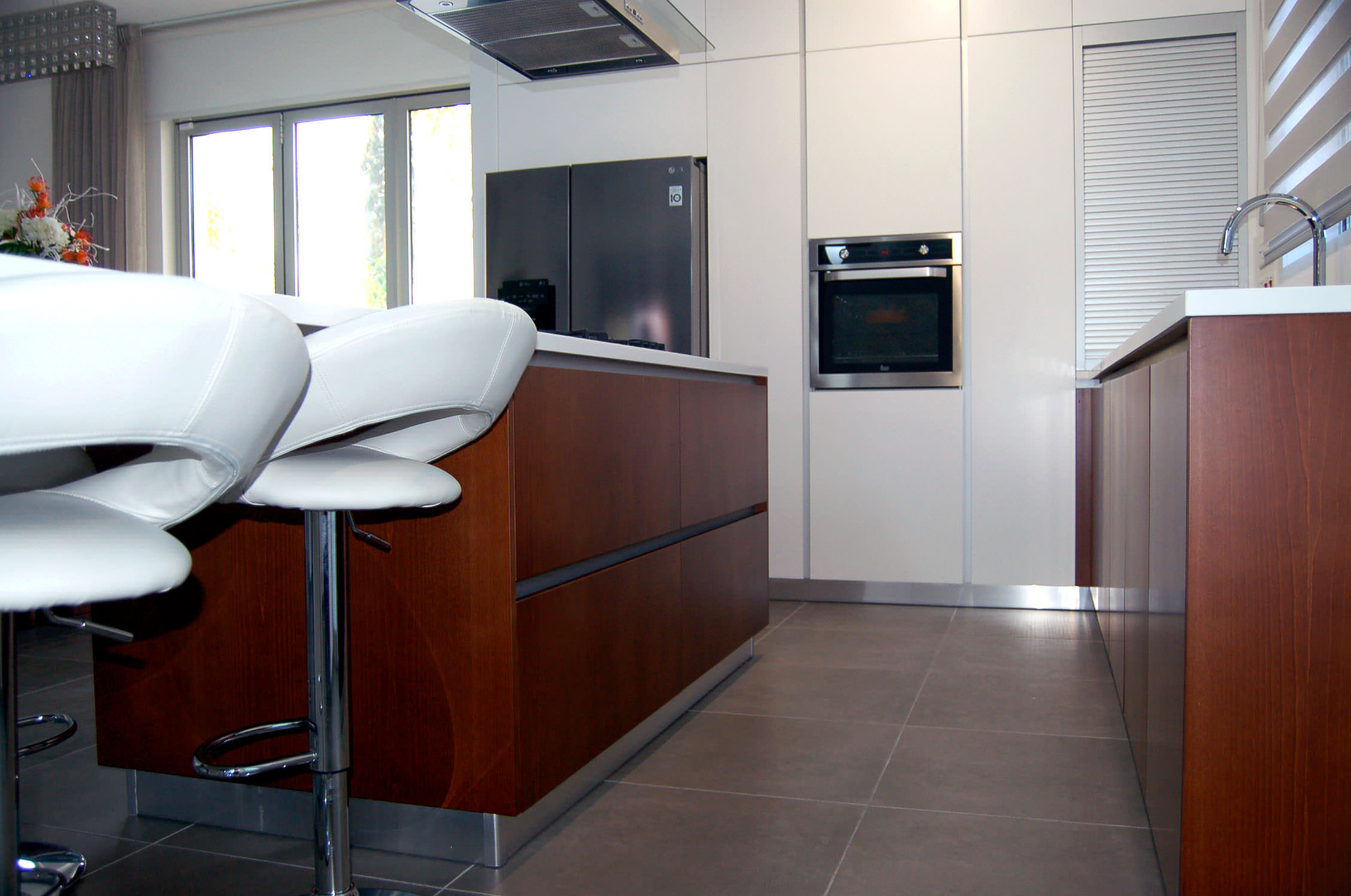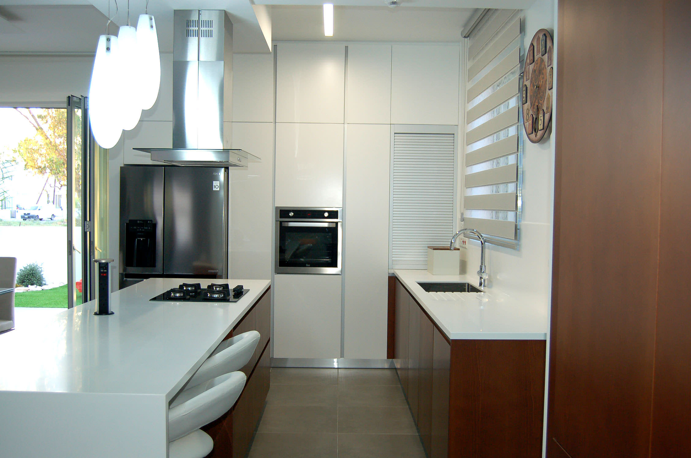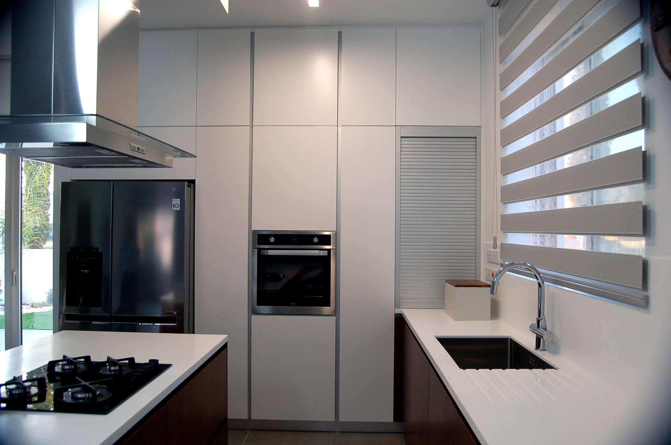 The tailor made kitchen was created with Cypriot materials in white mat, offering a modern view, while it involves ergonomic elements such handless top and base veneer wood units for a fully functional result.
