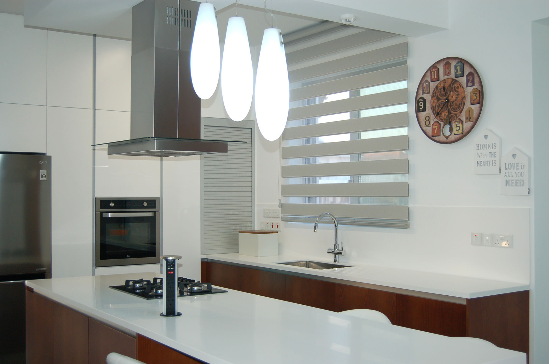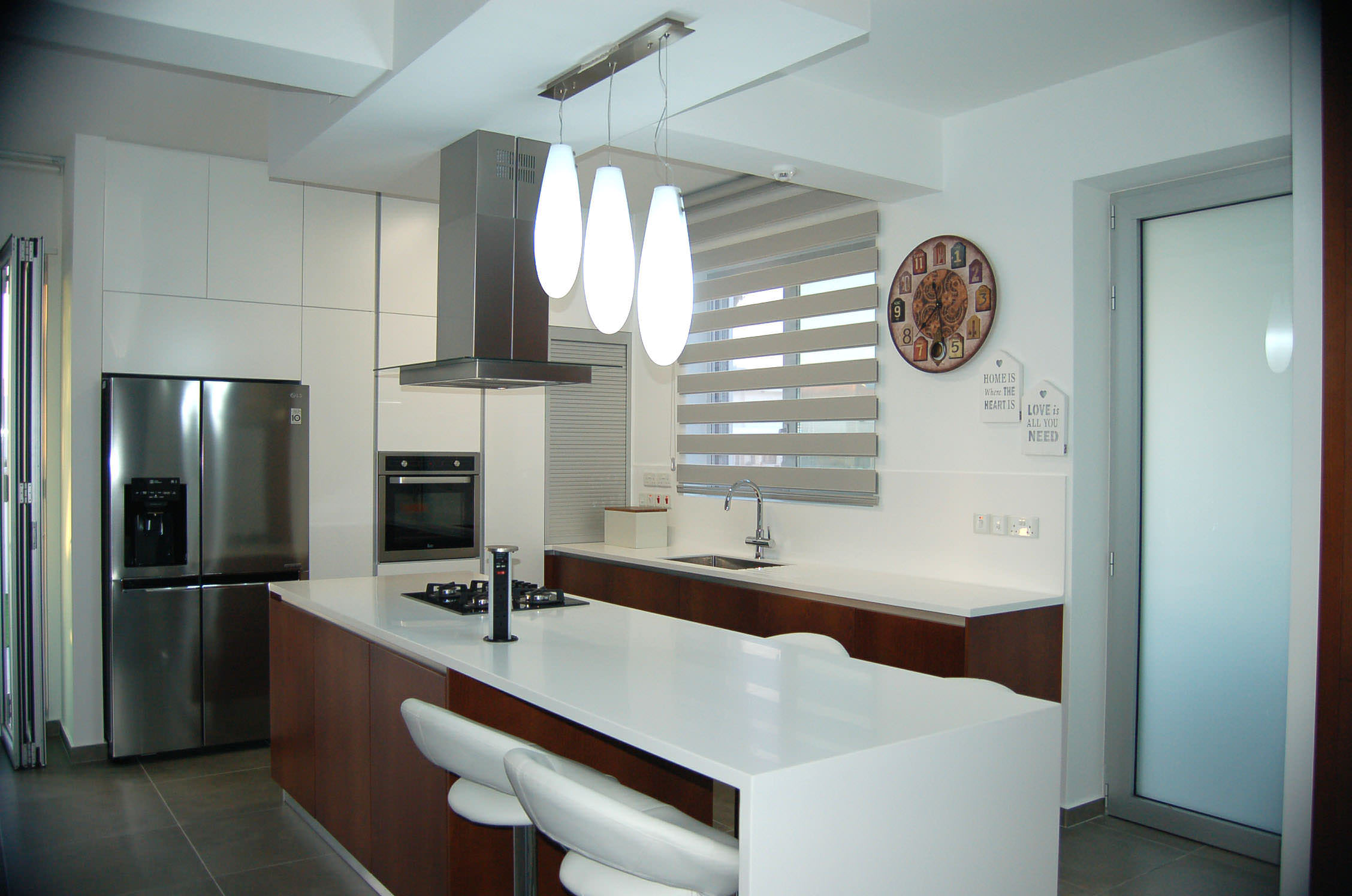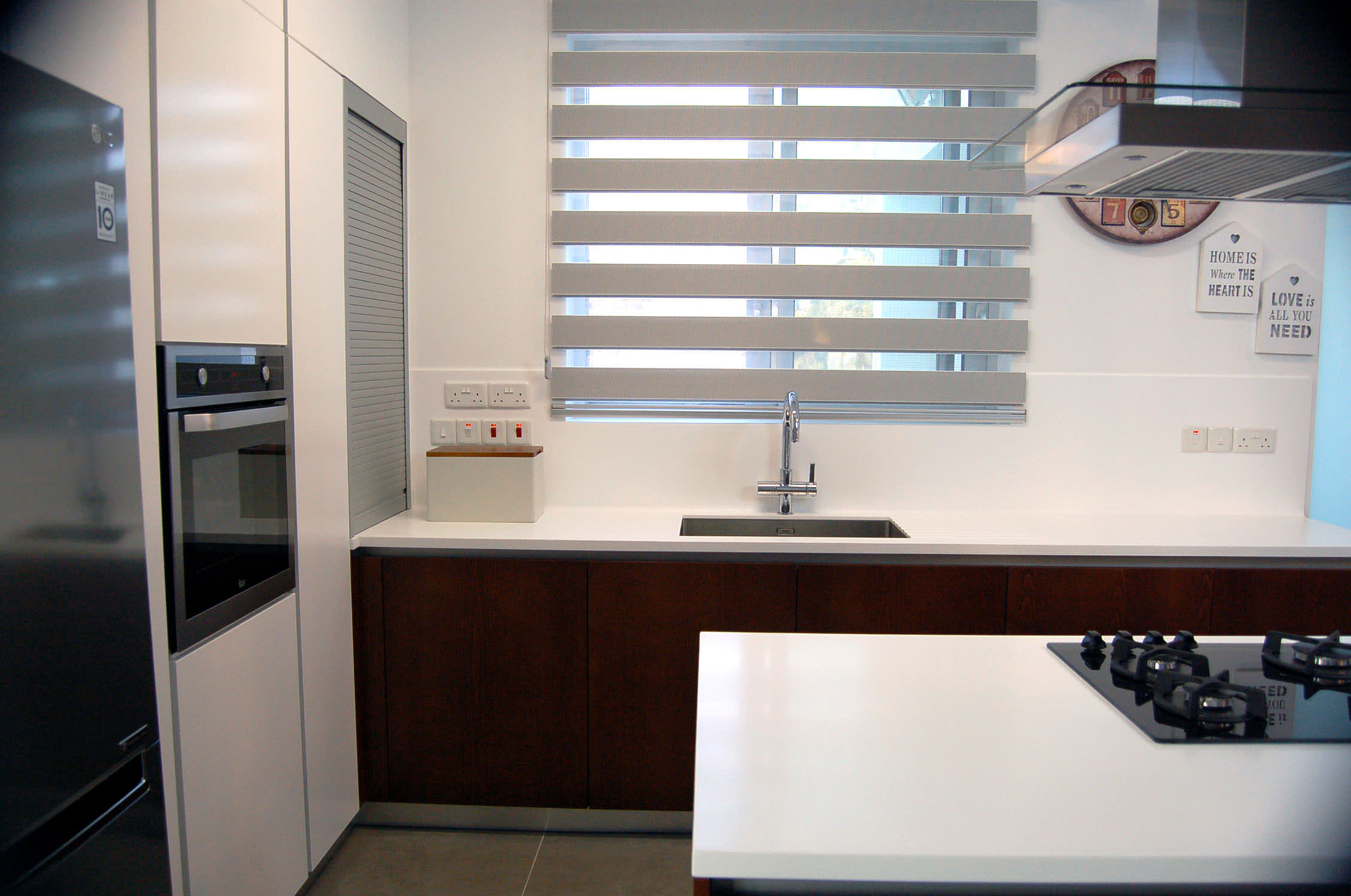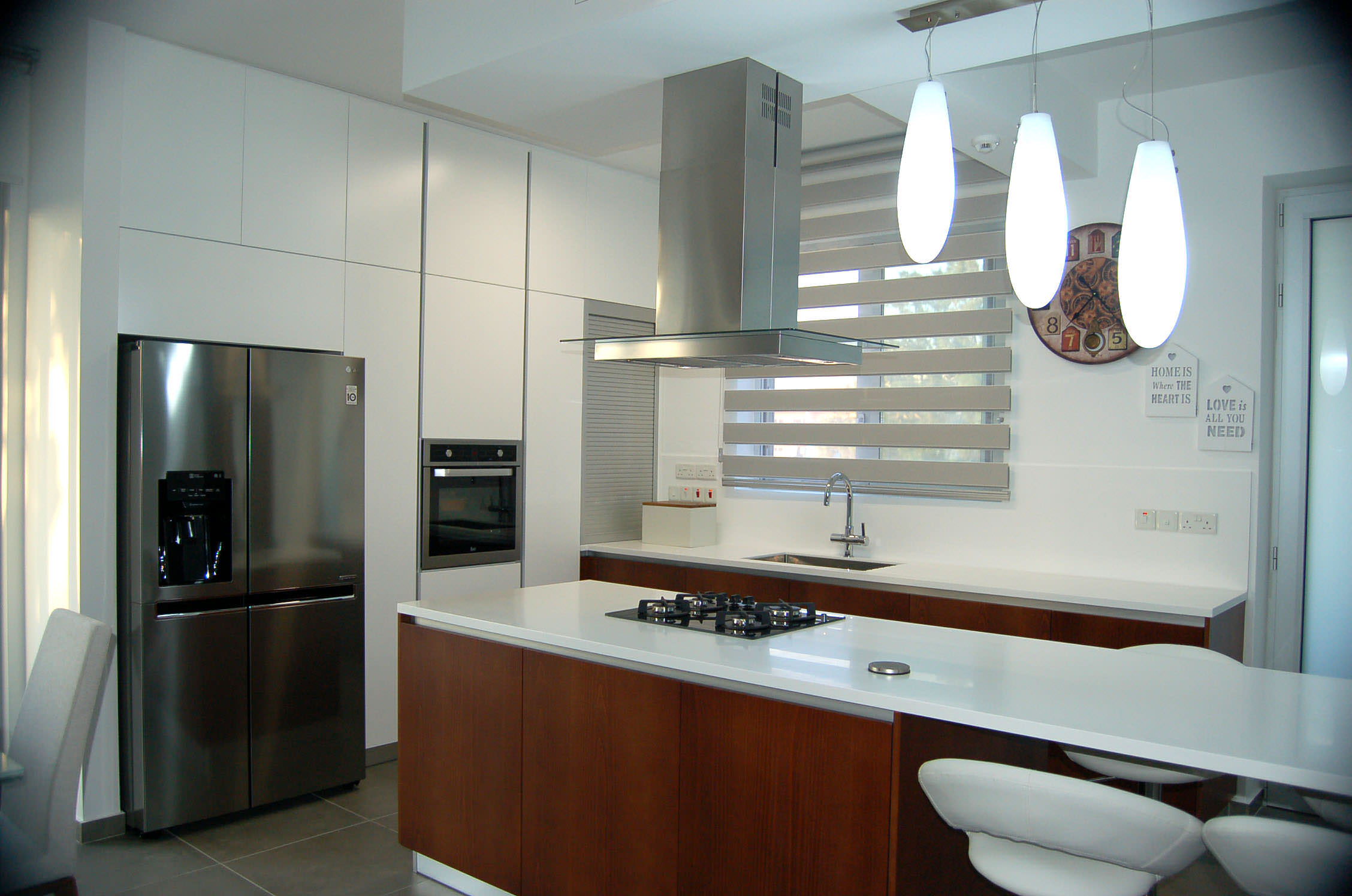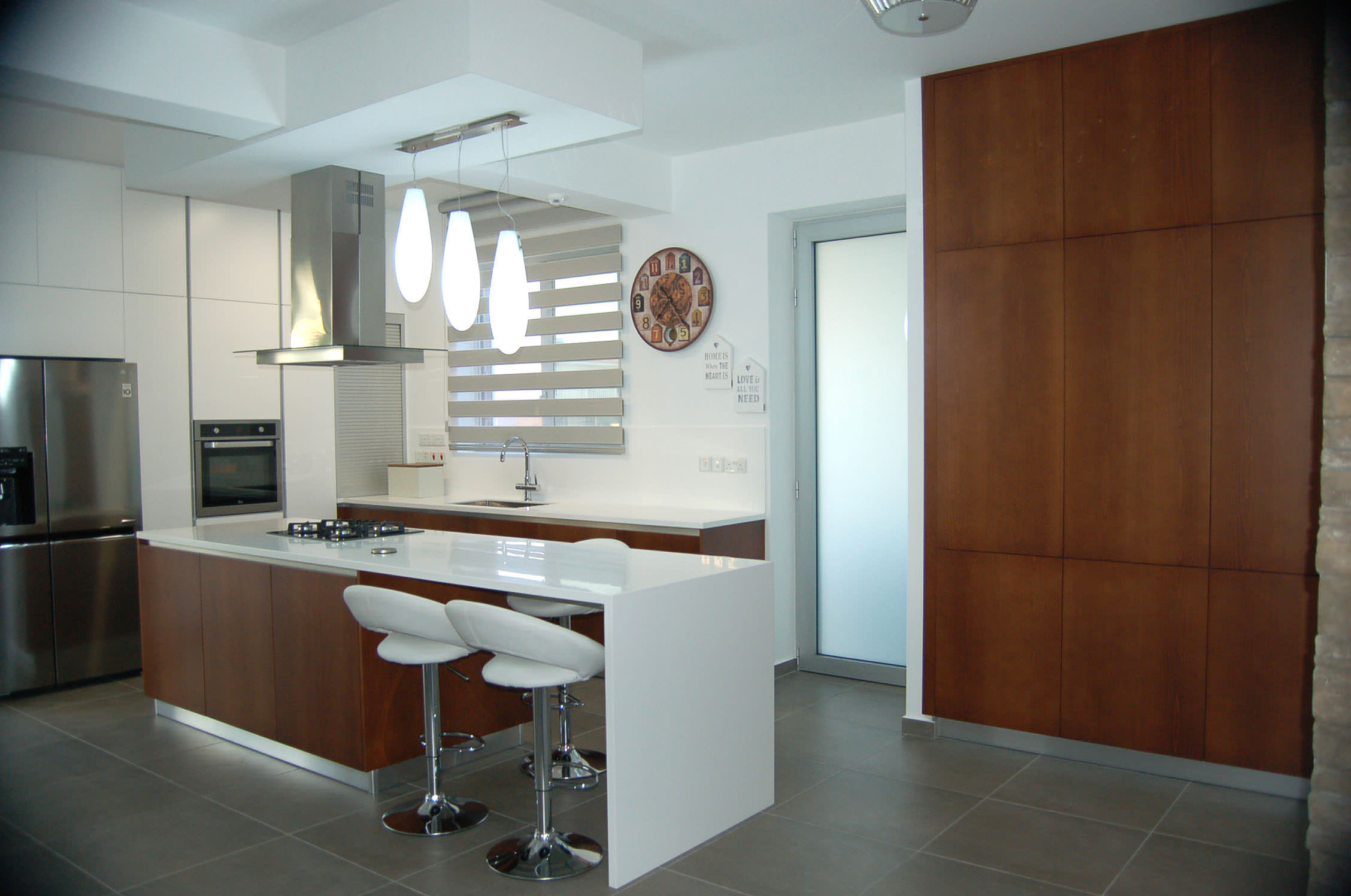 The tailor made kitchen was created with Cypriot materials in white mat, offering a modern view, while it involves ergonomic elements such handless top and base veneer wood units for a fully functional result.