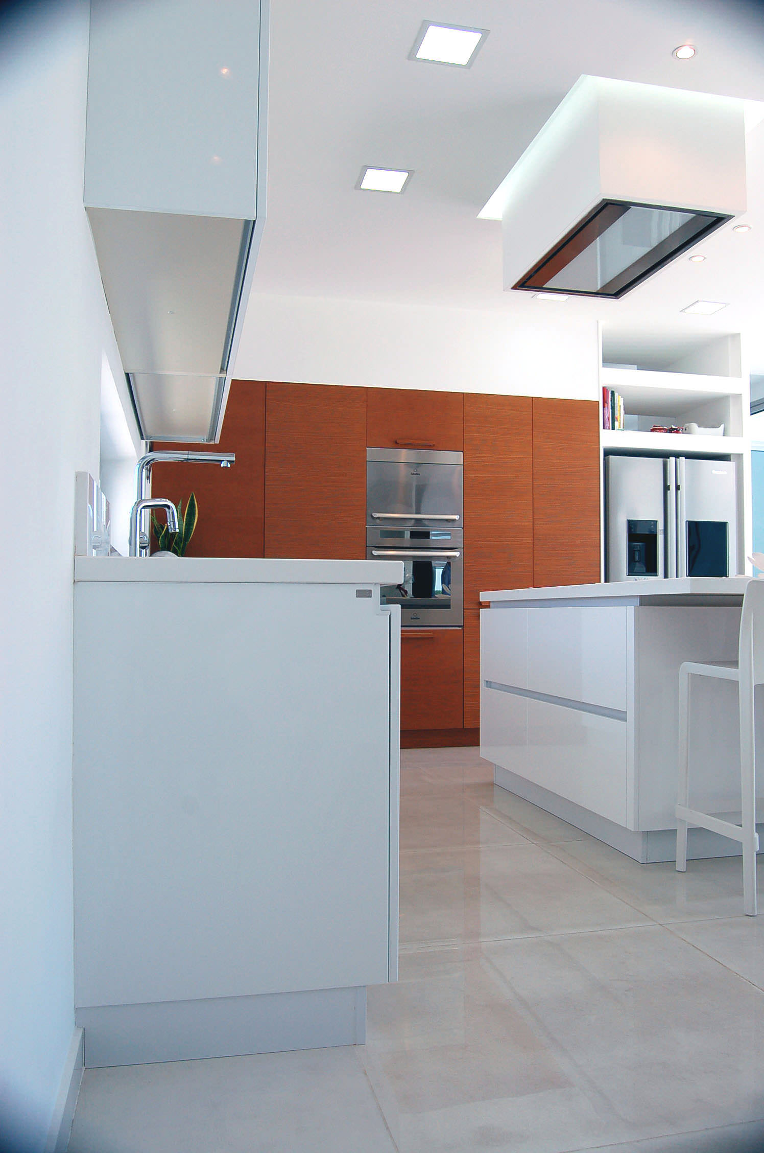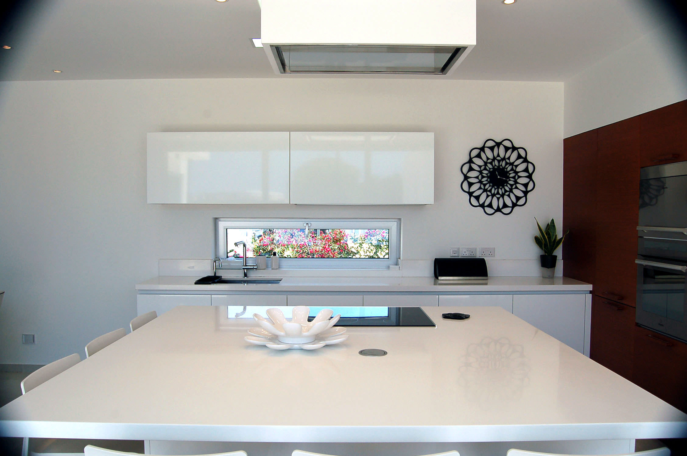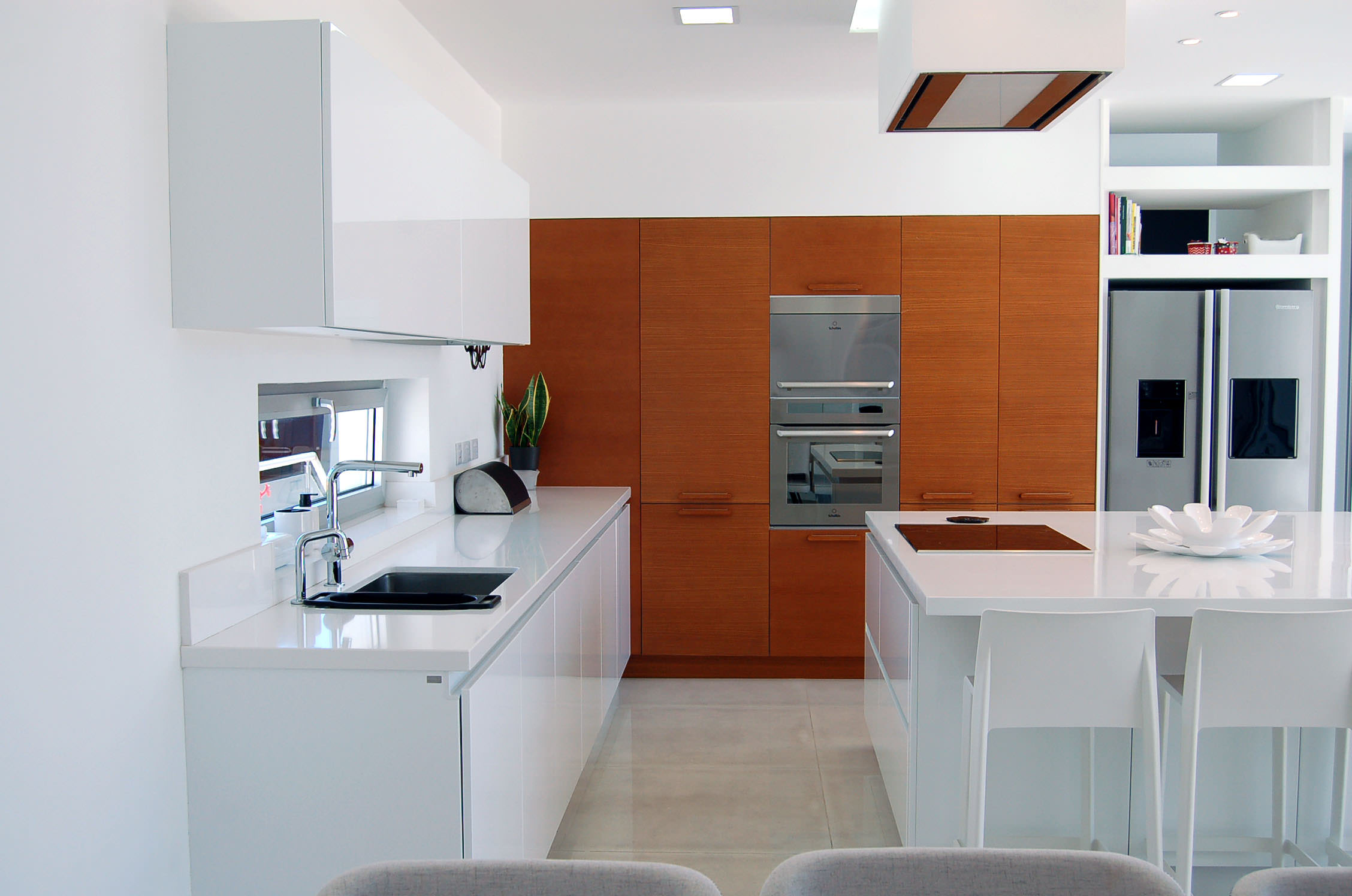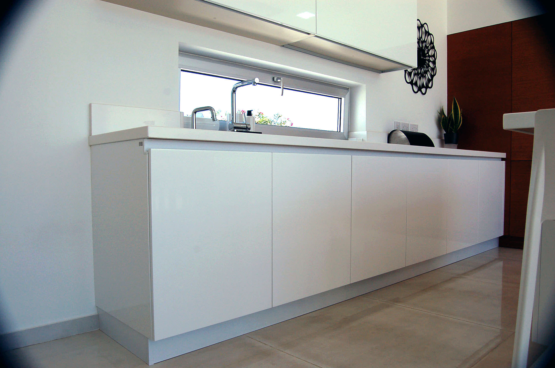 An alternative project with stylish and friendly looks. Kitchen Studio Living & More Interior Design Team presents the new modern kitchen created for the most recent project in Paralimni. Characterized by simple lines and innovative design, the kitchen was developed with Gruppo Euromobil’s Escape in polymeric white gloss finish for a stylish experience, as the storage units in veneered honey pine balance between contemporary and traditional leading to a new contemporary kitchen style.