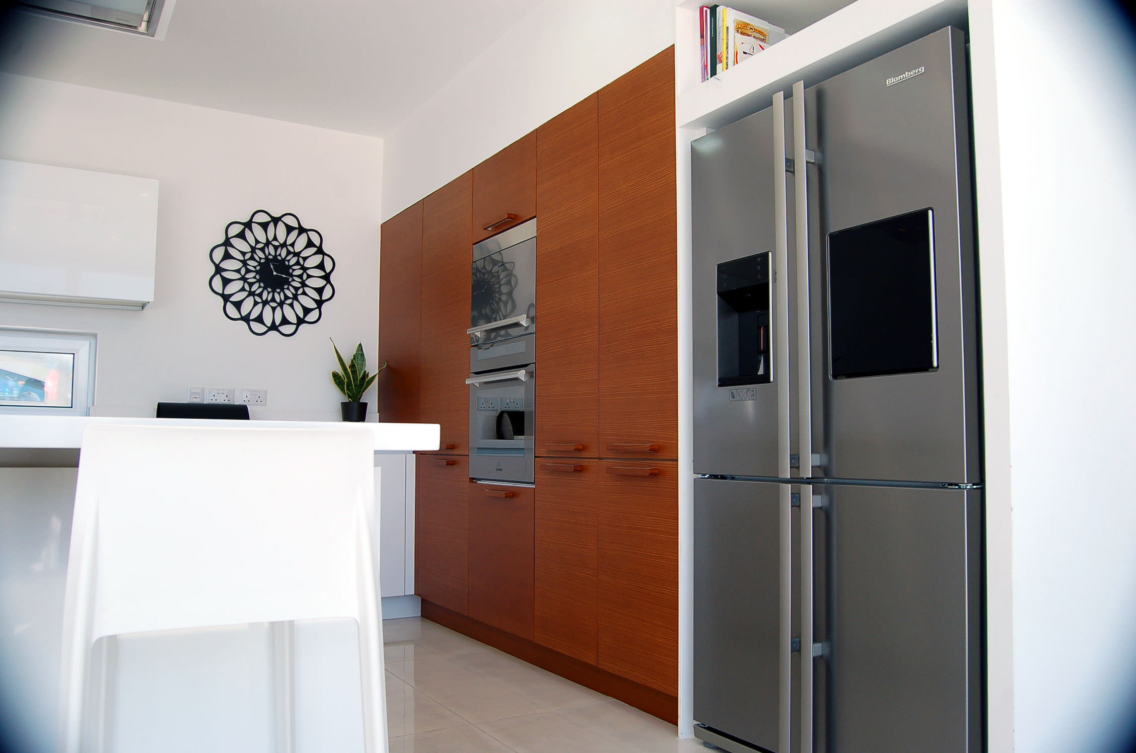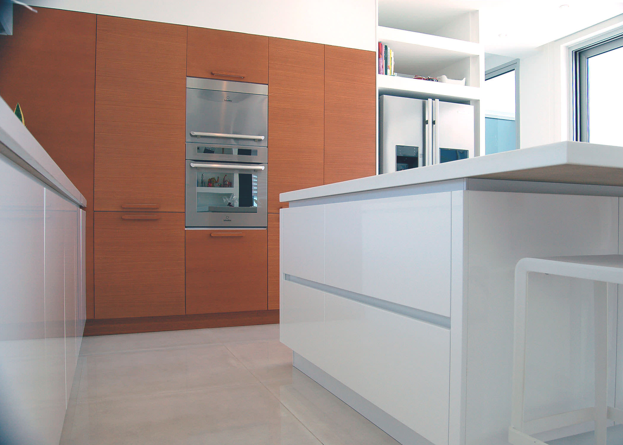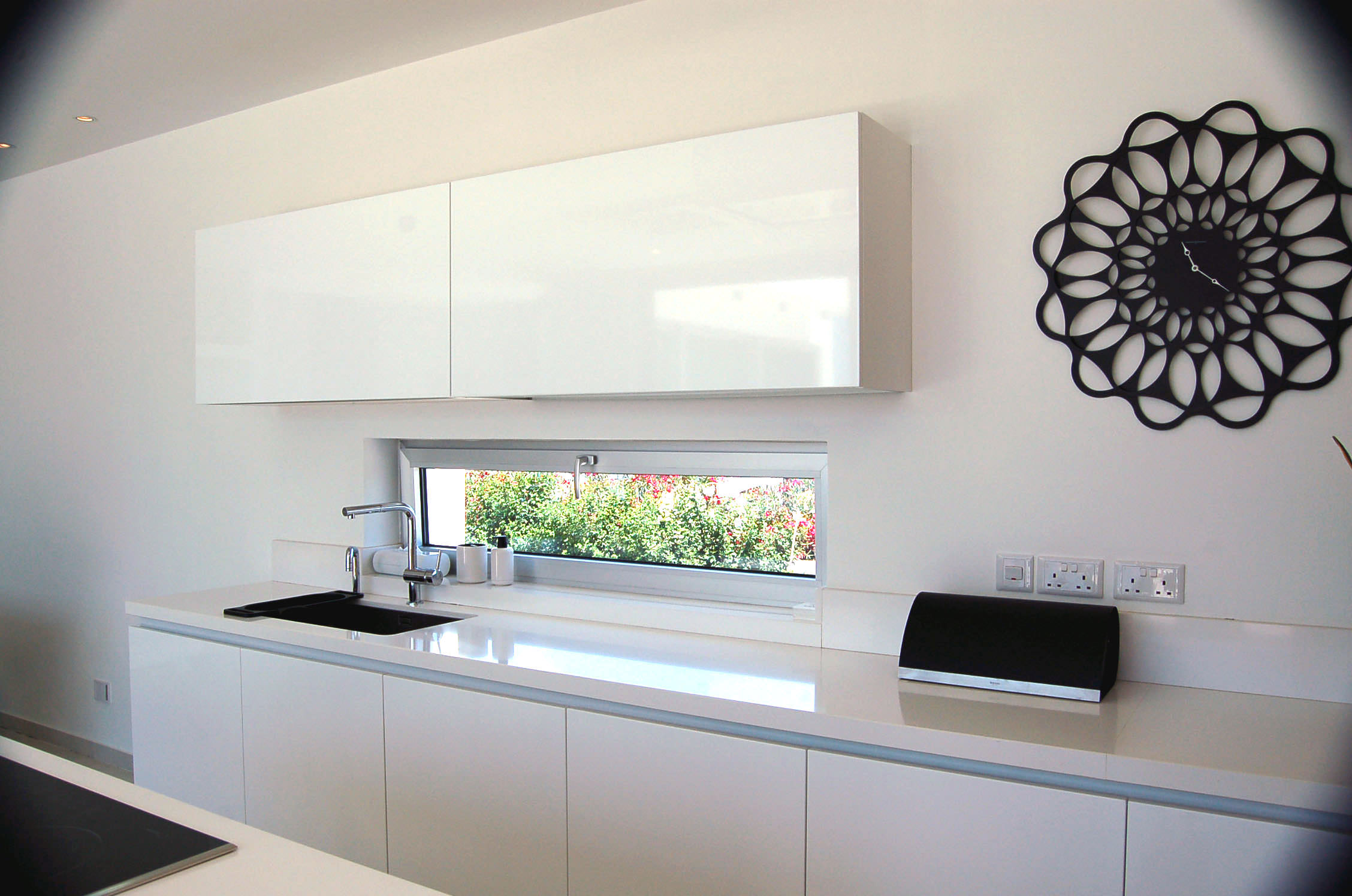 An alternative project with stylish and friendly looks. Kitchen Studio Living & More Interior Design Team presents the new modern kitchen created for the most recent project in Paralimni. Characterized by simple lines and innovative design, the kitchen was developed with Gruppo Euromobil’s Escape in polymeric white gloss finish for a stylish experience, as the storage units in veneered honey pine balance between contemporary and traditional leading to a new contemporary kitchen style.