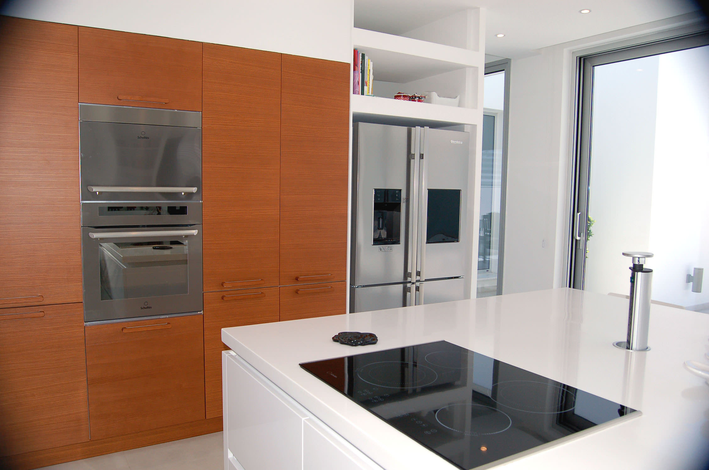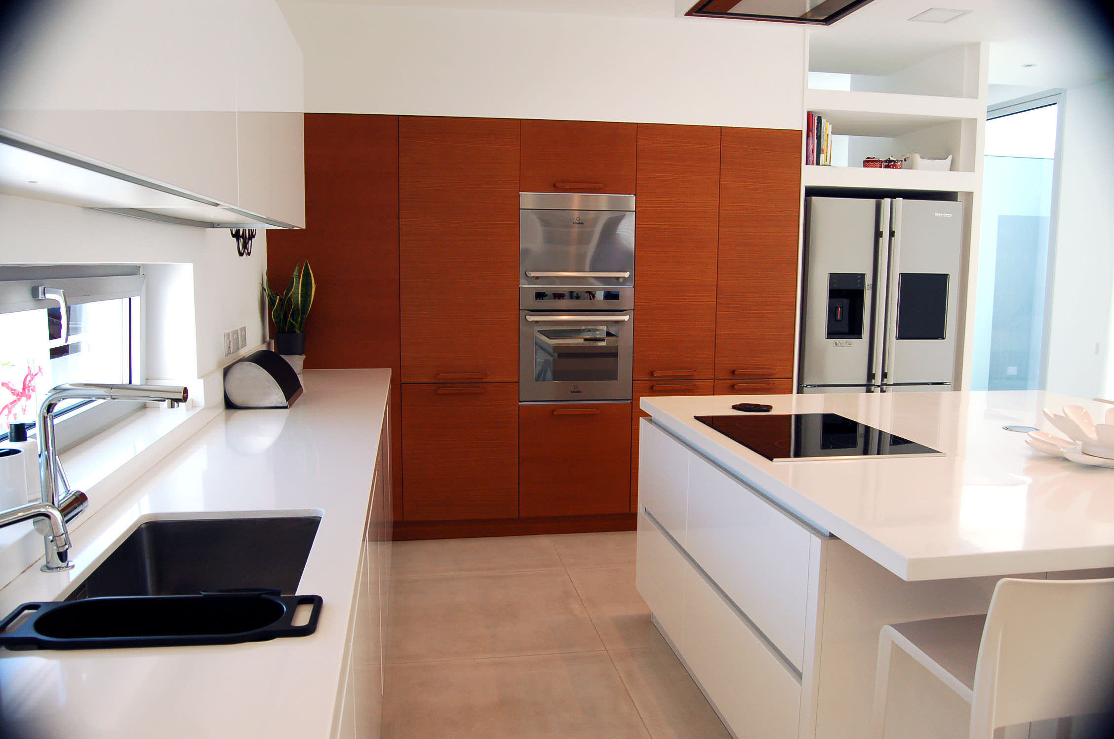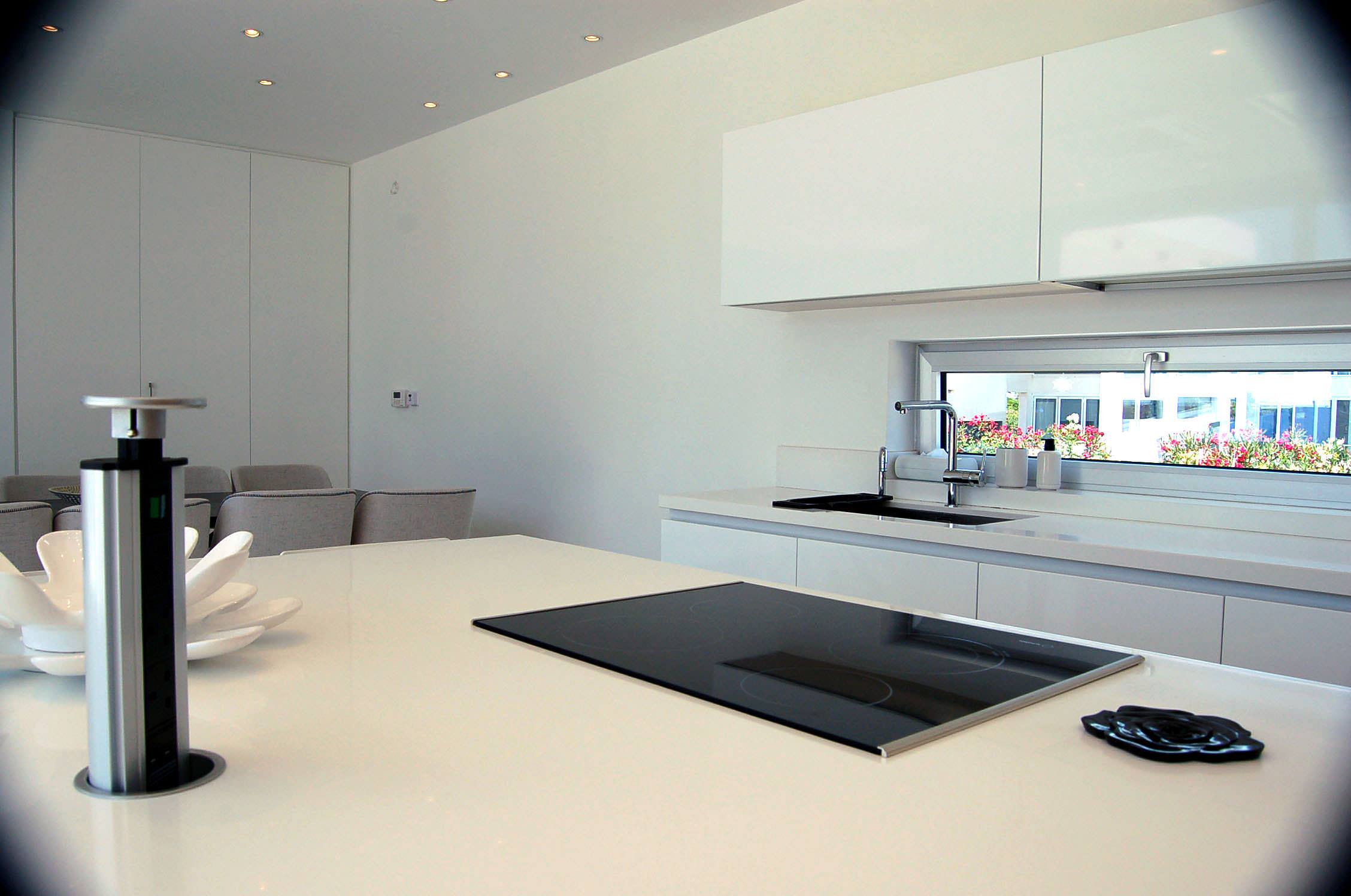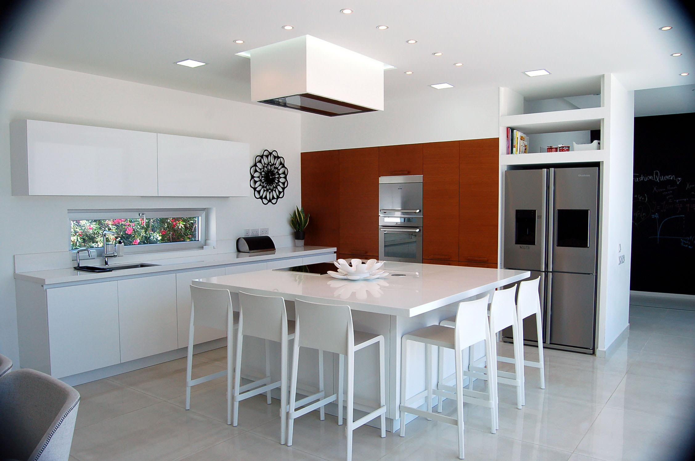 An alternative project with stylish and friendly looks. Kitchen Studio Living & More Interior Design Team presents the new modern kitchen created for the most recent project in Paralimni. Characterized by simple lines and innovative design, the kitchen was developed with Gruppo Euromobil’s Escape in polymeric white gloss finish for a stylish experience, as the storage units in veneered honey pine balance between contemporary and traditional leading to a new contemporary kitchen style.